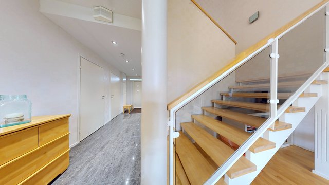 Yläkerrassa sijaitsevat kolme tilavaa makuuhuonetta, käytännöllinen vaatehuone sekä erillinen wc. Alakerrassa on näyttävä olohuone, jossa korkeaa tilaa ja suuret ikkunat tuovat valoa ja avaruutta. Olohuoneesta on suora käynti suojaisalle takaterassille. Tyylikäs Puustellin keittiö kivitasoilla tarjoaa erinomaiset puitteet ruoanlaittoon ja yhdessäoloon.