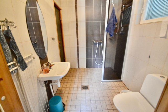 - WC-istuin, suihku, lattialämmitys, peili, allaskaappi, ja pesuallas