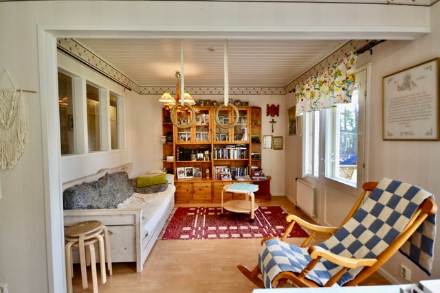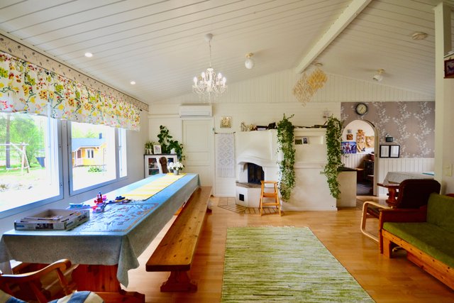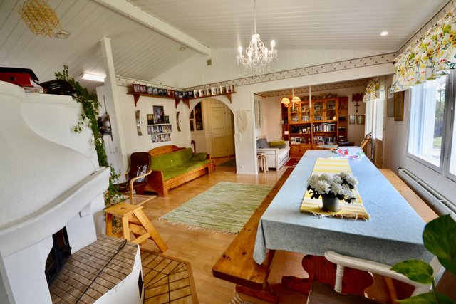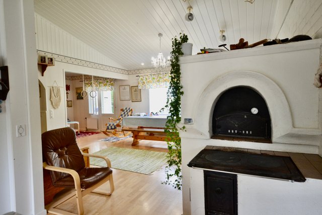 Yhteiset oleskelutilat on suunniteltu avariksi, korkeiksi ja viihtyisiksi. kaunis takka, leivinuuni ja puuhella luovat tunnelmaa koko taloon. Talo on laajennettu vuonna 1997. Laajennuksen myötä monipuolista tilaa on niin makuuhuonekäyttöön kuin työ- ja harrastetiloiksi.
