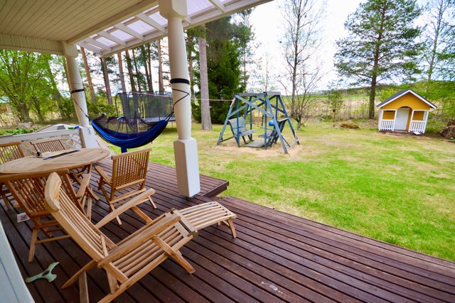 - Hieno tilava puutarhapiha. Tontti rajoittuu peltoalueeseen.