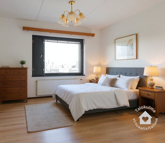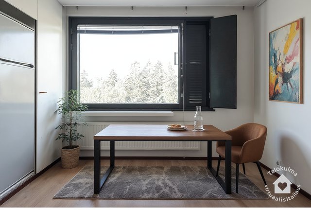Asunnossa on avara olohuone josta on kulku lasitetulle parvekkeelle. Parvekkeelta avautuvat näkymät kaupungin suuntaan. Keittiö on siistikuntoinen ja kaappi- ja laskutilaa löytyy reilusti. Pöytä mahtuu ikkunan ääreen helposti. Kylpyhuone on iso ja pesukone menee tilaan vaivatta. Lisäksi huoneistoon kuuluu erillinen vaatehuone.