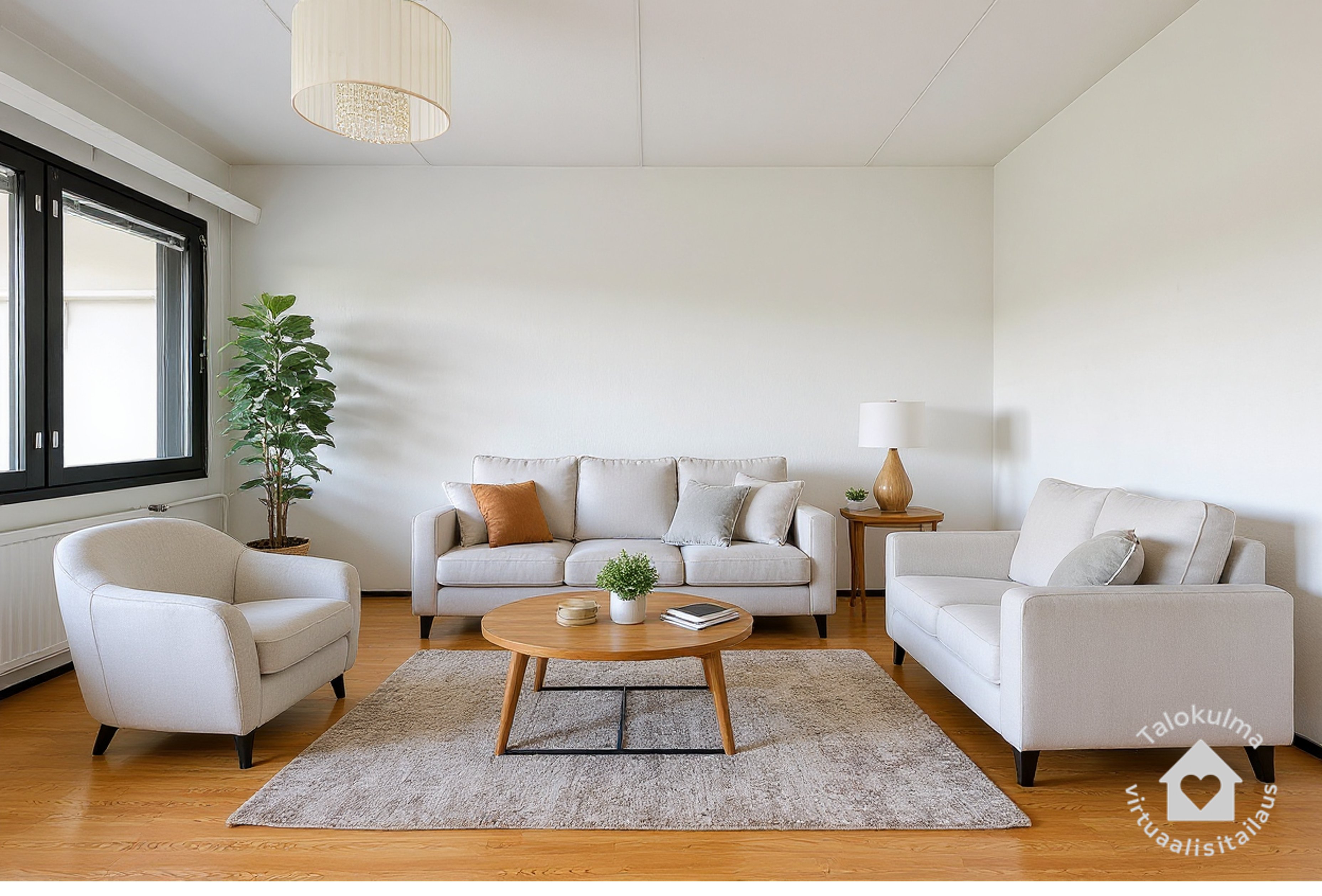 - Iso ja avara olohuone josta kulku lasitetulle parvekkeelle.