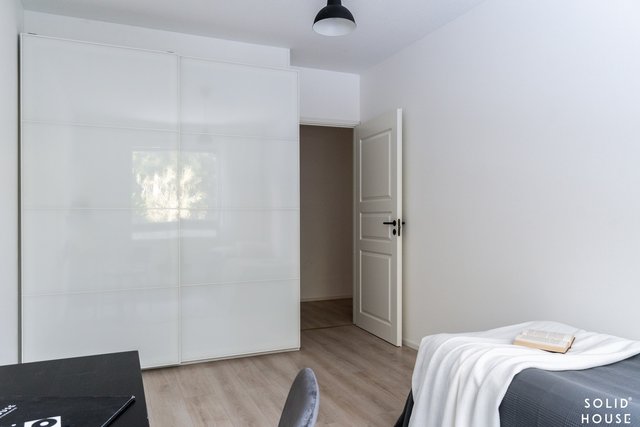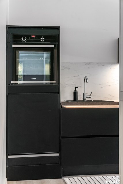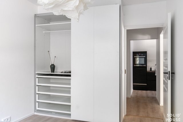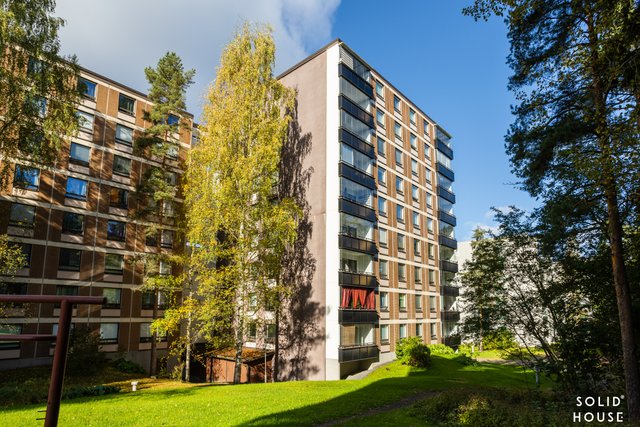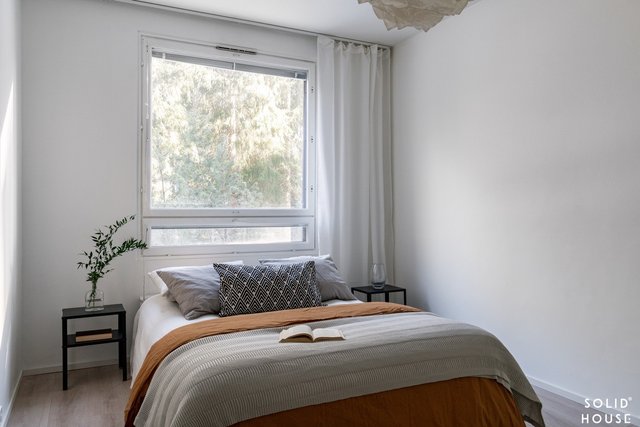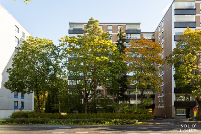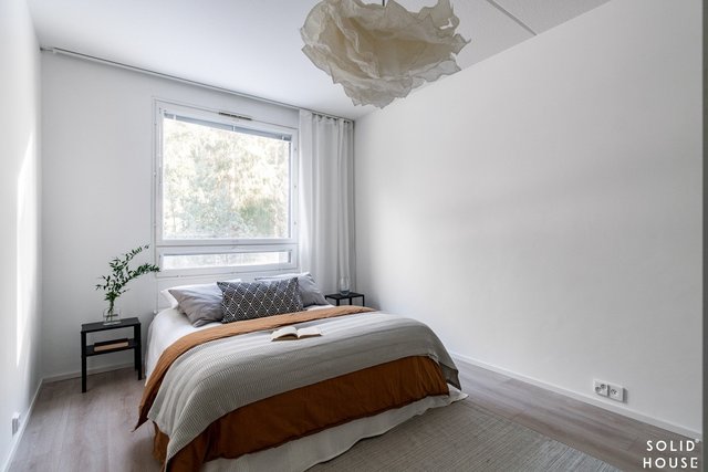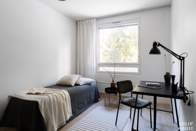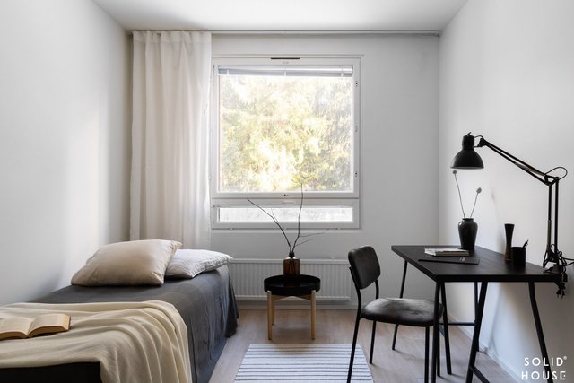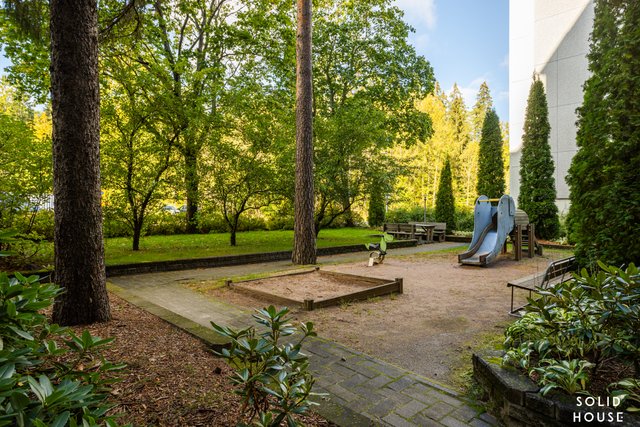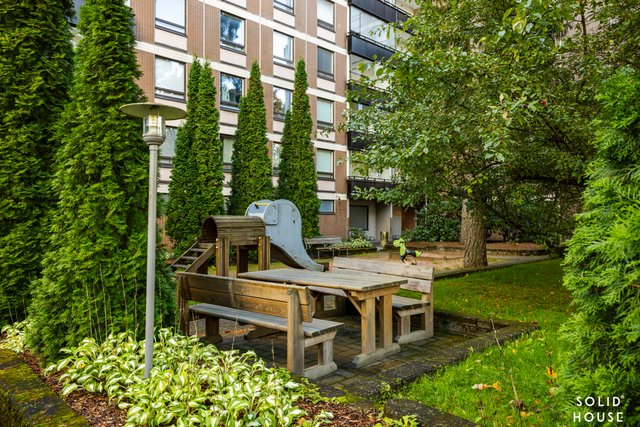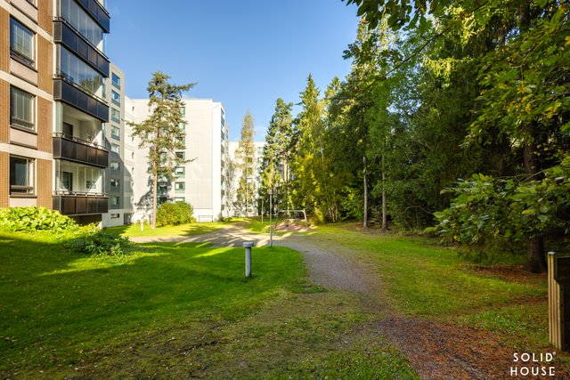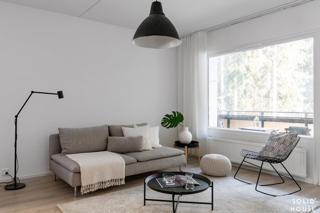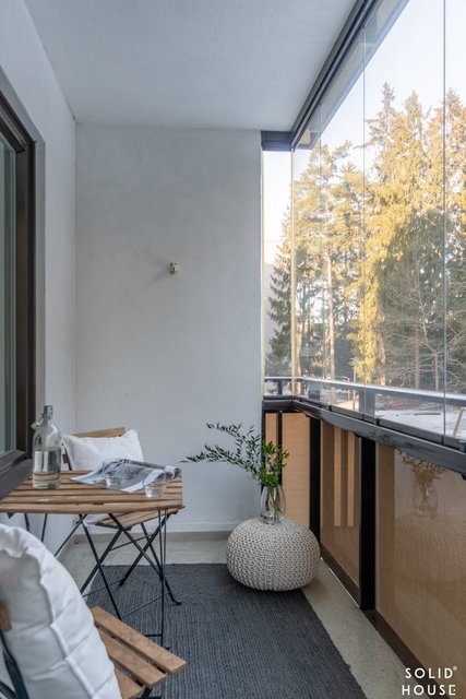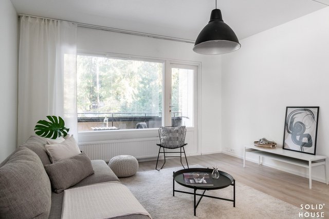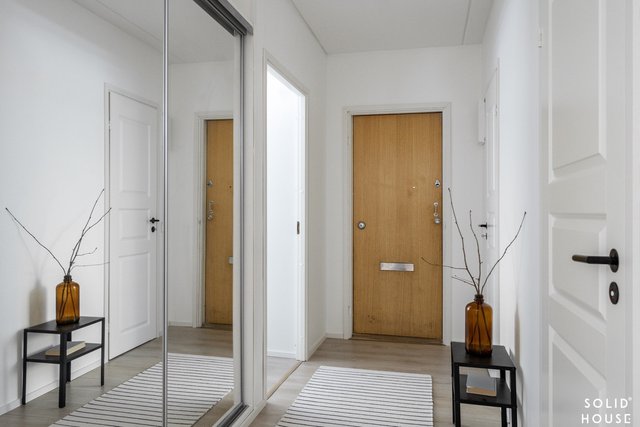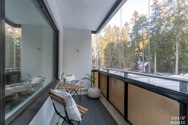 Keittiö ja olohuone muodostavat avaran, yhtenäisen kokonaisuuden, joka kutsuu viihtymään. Olohuoneesta on kulku tilavalle, lasitetulle parvekkeelle, josta avautuvat vehreät näkymät ja joka tulvii kotiin runsaasti luonnonvaloa. Säilytystilaa on runsaasti. Kaapistojen lisäksi käytössä on erillinen vaatehuone, joka helpottaa arjen järjestelyjä ja pitää kodin selkeänä.