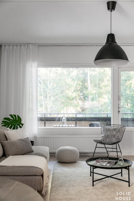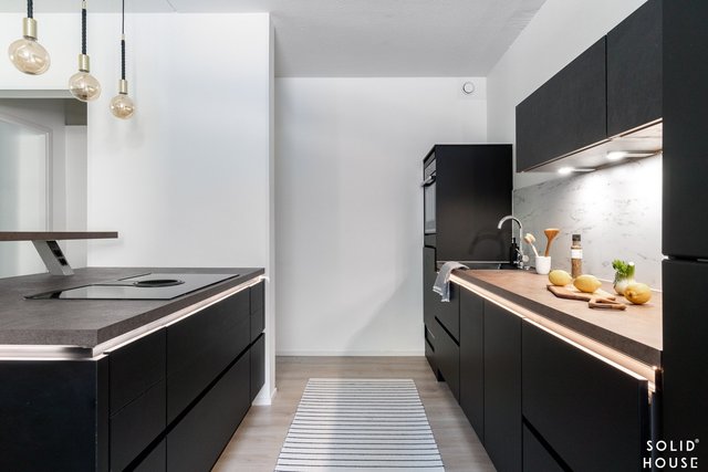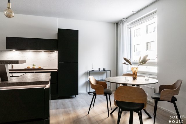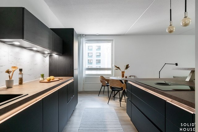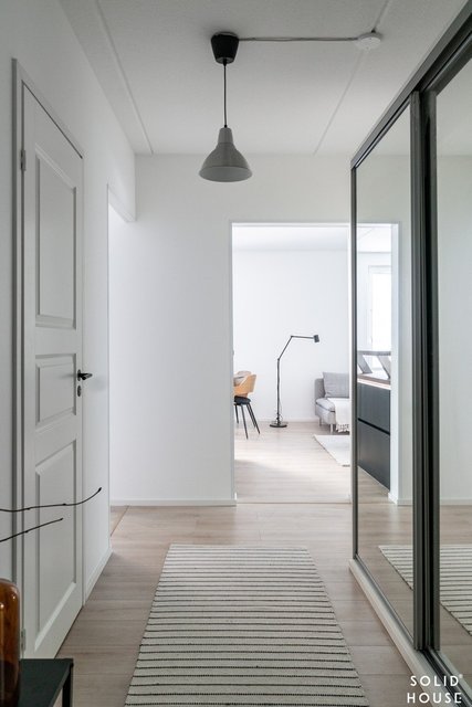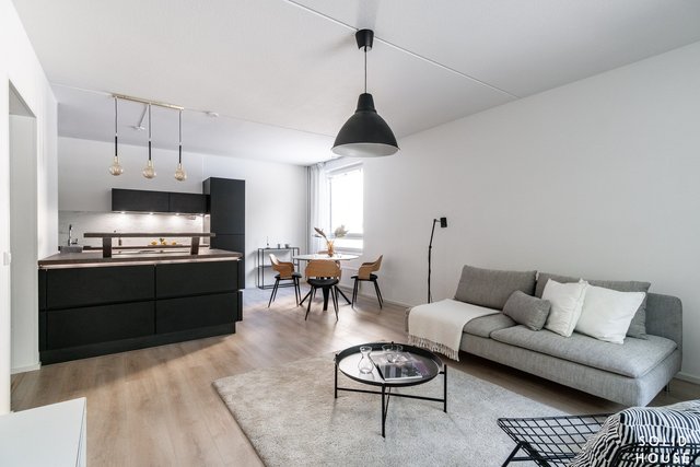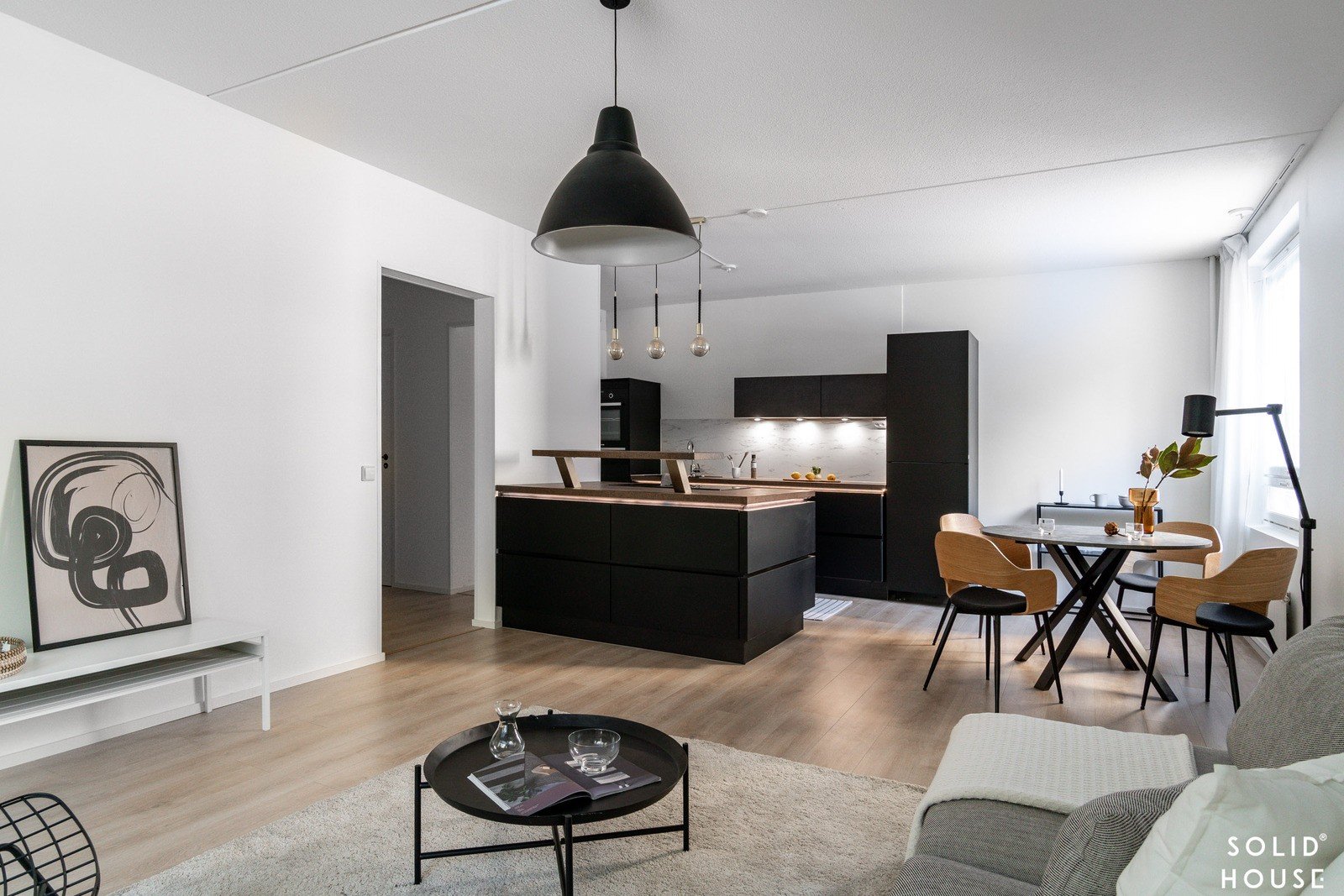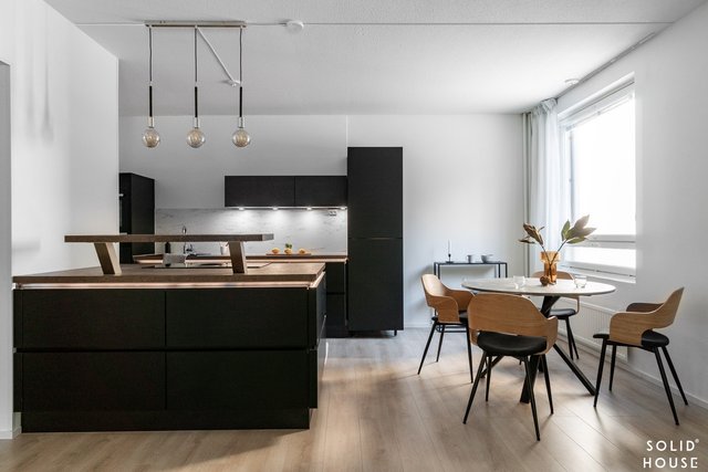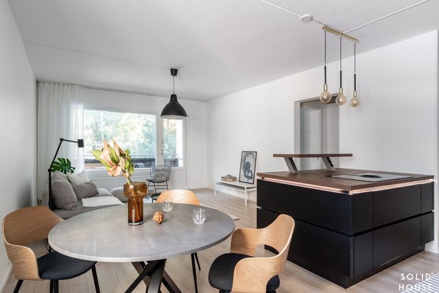Tämä kauniisti remontoitu 75 m² asunto hurmaa ajattomilla materiaalivalinnoillaan ja harmonisella värimaailmallaan, jotka luovat lämpimän ja kodikkaan tunnelman.