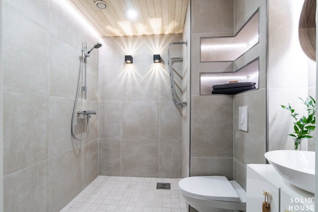 - WC-istuin, suihku, pesuallas (Pesuallas vaihdettu. Ei vastaa kuvan pesuallasta.), allaskaappi, bidee-suihku, pesukoneliitäntä, ja suihkuseinä (Lisätty kirkas suihkuseinä mustilla kehyksillä.)
