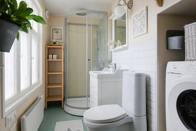 - Yläkerran kylpyhuoneessa ihastuttava ikkuna ja kaunis, perinteinen salmiakkiruutuinen laattalattia sekä tilaan räätälöidyt ja vanhan talon henkeen sopivat kalusteet: 1kpl suihku, wc-istuin, kaapisto, allaskaappi ja peili. Alakerran kylpyhuoneessa ikkuna, suihkukaappi, allaskaluste, peili, wc-istuin ja pyykinpesukoneliitäntä.