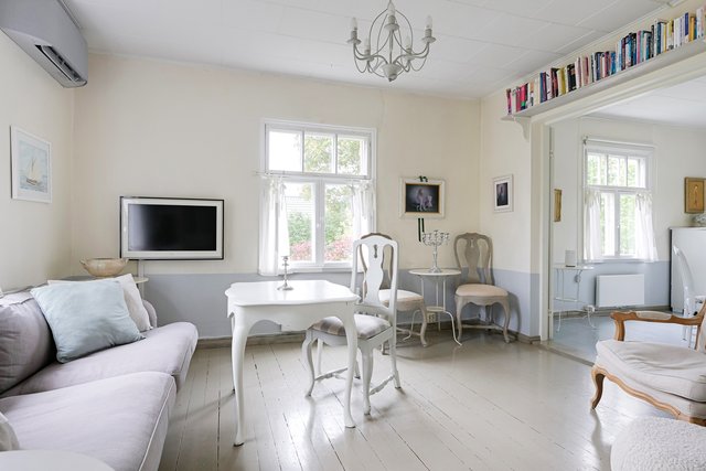 - Avara olohuone, johon tulee luonnonvaloa kolmesta ilmansuunnasta. Seinässä lämmittämässä/viilentämässä ilmalämpöpumppu.