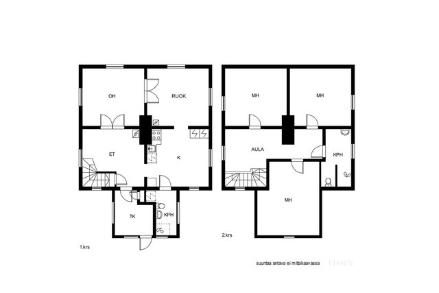 - Alakerrassa puulattiat, yläkerrassa leveät lankkulattiat, yläkerran kylpyhuoneessa laatta/luonnonkivi ja alakerran kylpyhuoneessa muovimatto.