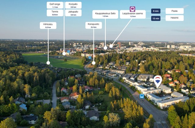 Tervetuloa Leppävaaraan! Kauppakeskus Sellon kattavat palvelut sekä juna-asema ovat vain lyhyen kävelyn tai 5 minuutin bussimatkan päässä. Läheisin bussipysäkki löytyy heti rakennuksen kulmalta. Julkiset yhteydet toimivat hyvin myös metroasemille, sillä pikaratikalle kävelee noin 10 minuutissa ja matka ratikalla Aalto Yliopistolle (M) vie vain 9 minuuttia. Koulumatka on erittäin helppokulkuinen - vain 800 metriä suoraa tietä pitkin. Lähistöllä on myös useita päiväkoteja suomen, ruotsin tai englannin kielellä. Harrastus- ja ulkoilumahdollisuuksia on alueella runsaasti ympäri vuoden. Kävelyetäisyydellä mm. Hiihtolatu, koirapuisto sekä tennis-, luistelu, jalkapallo- ja koripallokentät. Parin kilometrin päästä löytyy myös Leo's sisäleikkipuisto, kiipeilypuisto, uimahalli, maauimala sekä ratsastuskoulu.
