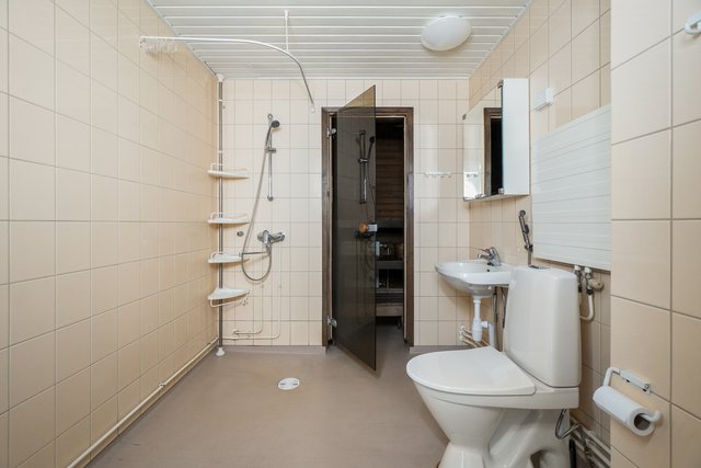 - WC-istuin, suihku, bidee-suihku, pesuallas, pesukoneliitäntä, ja peilikaappi