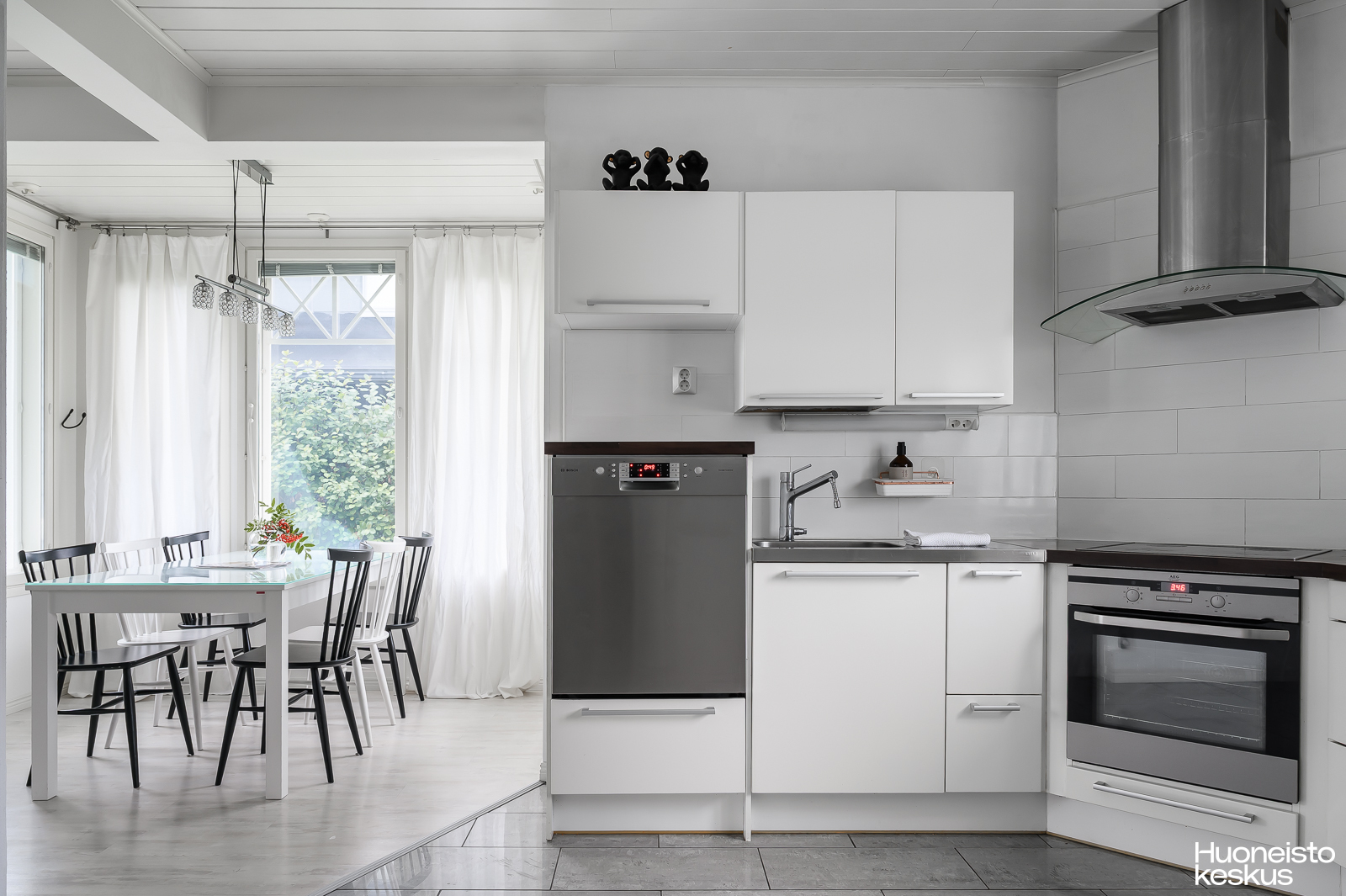 Vaalea keittiö on suuri ja tarjoaa hienot puitteet ruoanvalmistukseen. Säilytystilaa on hyvin ja työskentelytilaa hienosti. Olitpa kotikokki tai leipuri, tästä nauttii varmasti arjessa. Keittiössä on myös upea leivinuuni, jossa haudutat maukkaimmat pataruoat ja valmistat herkullisimmat pitsat. Ruokailulle on kaunis ja valoisa tila erkkerissä.