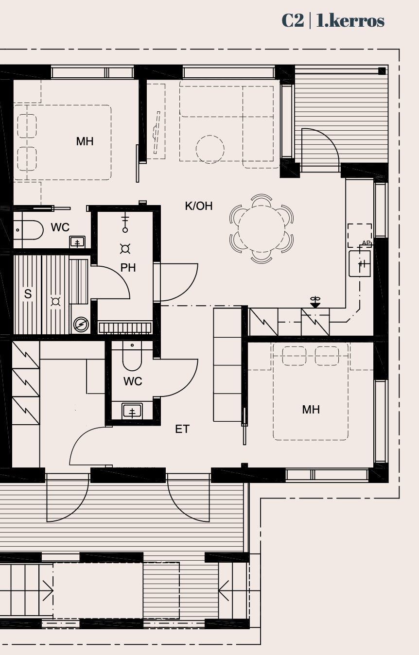 The apartment's tile floors and log panel walls create a warm and stylish atmosphere. The apartment has two bedrooms, one of which has its own toilet, adding a touch of everyday luxury to living. The fully equipped kitchen includes an induction cooktop and integrated dishwasher, and the private sauna and balcony complete the package – the perfect place to relax after a day of activities.