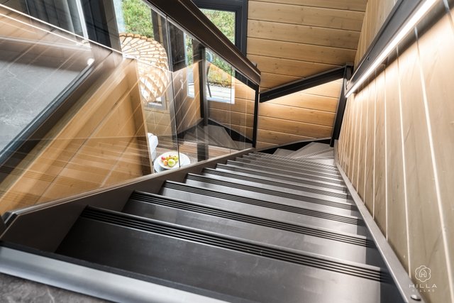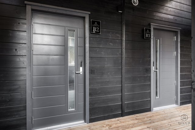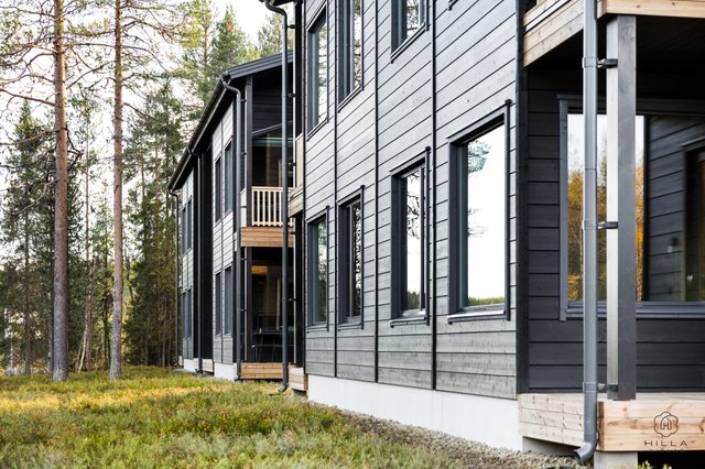 The building has a parking space with a charging point for each apartment in the courtyard. The maintenance company takes care of property maintenance and waste management – for a carefree vacation all year round. The buildings are PolarHouse log houses that combine energy efficiency, ecology, and architecture that blends in with the Lapland nature.