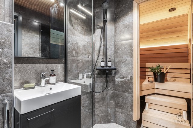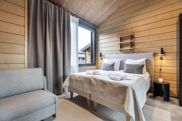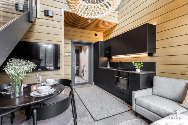 The apartment's tile floors and log panel walls create a warm and stylish atmosphere. The fully equipped kitchen includes an induction cooktop and integrated dishwasher, and the private sauna and balcony complete the package – the perfect place to relax after a day of activities.