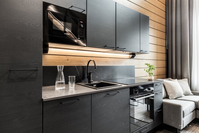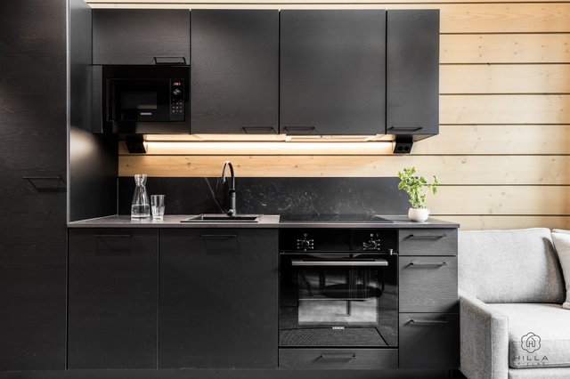 - Kalusteuuni, induktio liesi neljällä keittolevyllä, jää-pakastinkaappi, mikroaaltouuni ja integroitu astianpesukone sekä liesituuletin aktiivihiilisuodattimella.