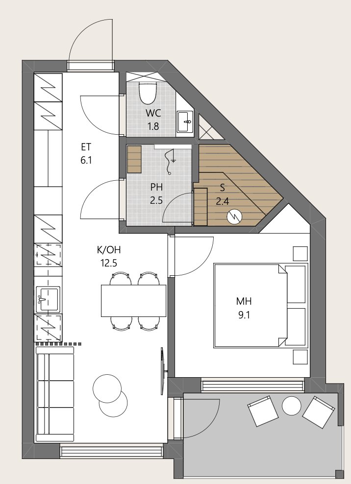 Huoneistoihin on valittavana kaksi eri sävyvaihtoehtoa, tyylikäs greige ja rouhea graniitti.