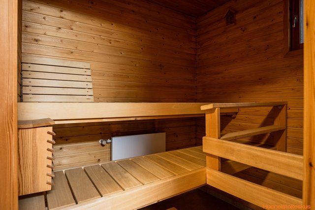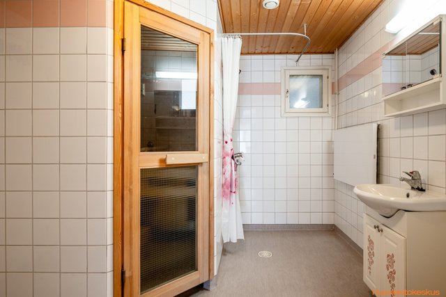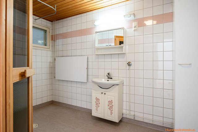Pesuhuoneessa on ikkuna, joka tuo luonnonvaloa tilaan, ja oma sauna tarjoaa rentouttavia hetkiä arjen keskellä.