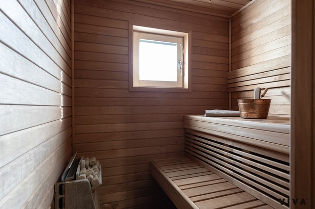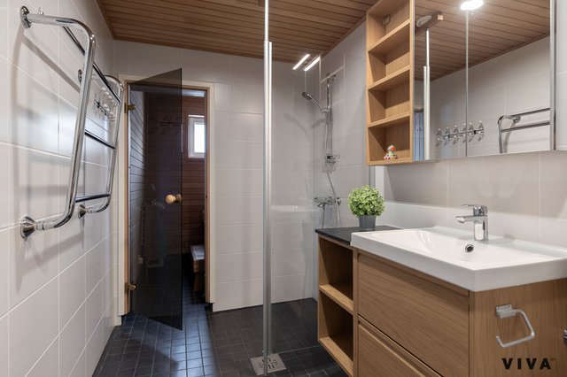 Vuonna 2025 laadukkaasti uusittu kylpyhuone ja sauna viimeistelevät kokonaisuuden. Modernit materiaalit, ajattomat sävyt ja huolellinen työnjälki tuovat arkeen ripauksen luksusta – tänne on ilo palata päivän päätteeksi rentoutumaan.