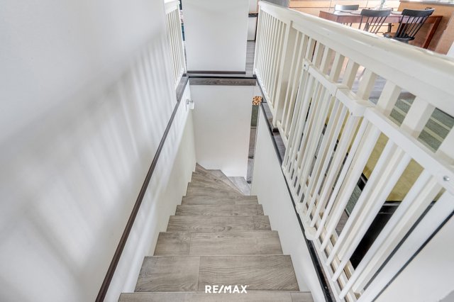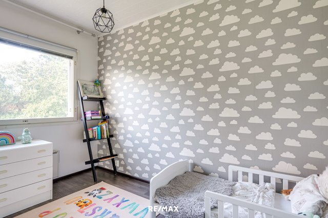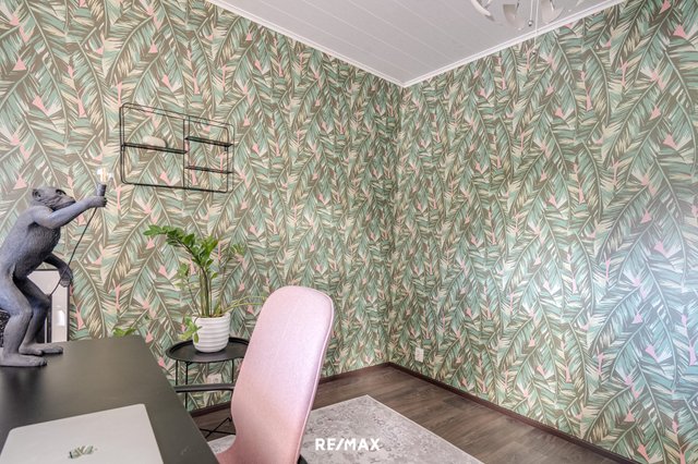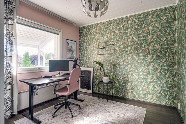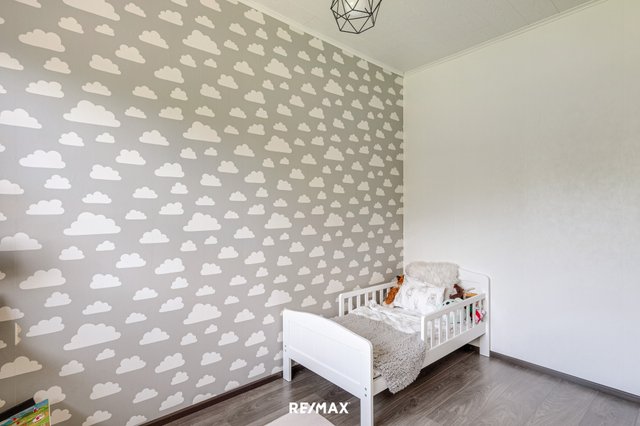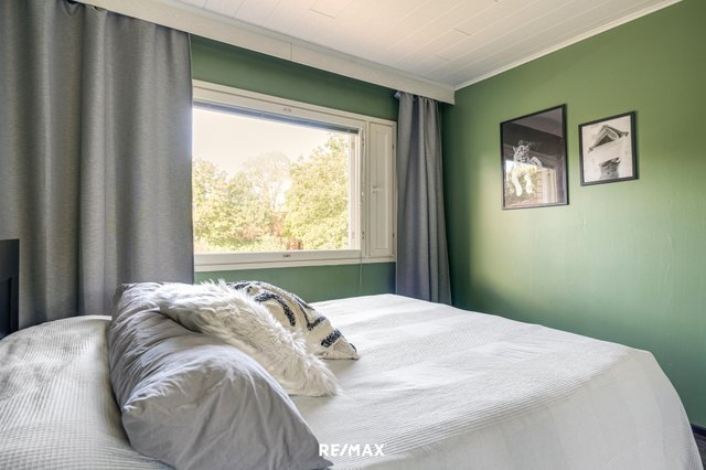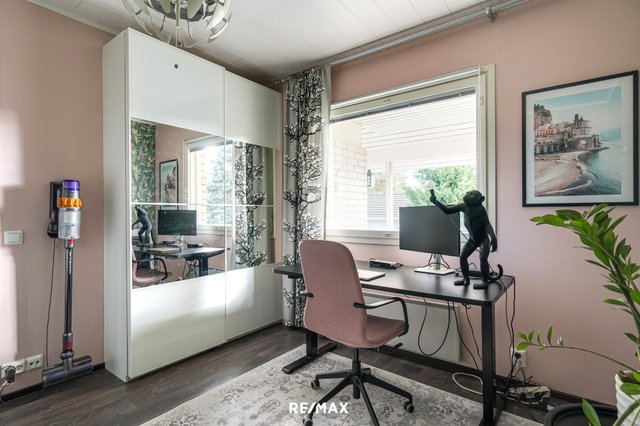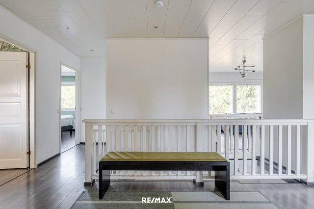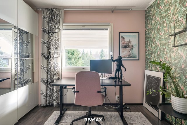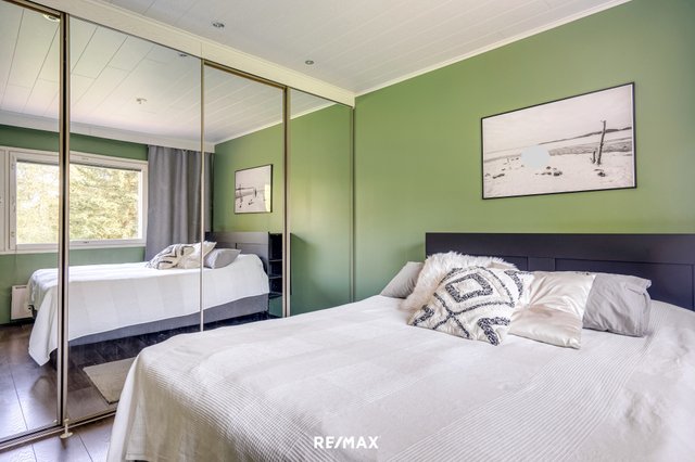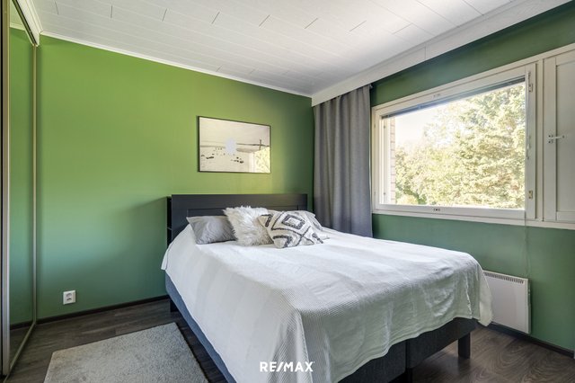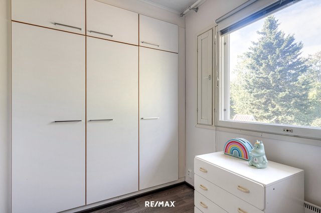 - Yläkerrassa sijaitsevat kodin kolme makuuhuonetta, joista jokaisen yhteydessä on vaatekaapistot joko peililiukuovilla tai kääntöovilla. Alakerran ikkunaton varastohuone on makuuhuoneen kokoinen, ja se palvelisikin hyvin vaikka vierashuoneena, leffateatterina, työhuoneena, kuntosalina tms.