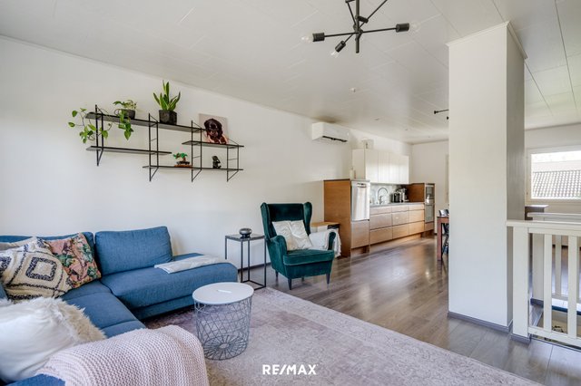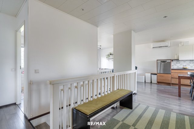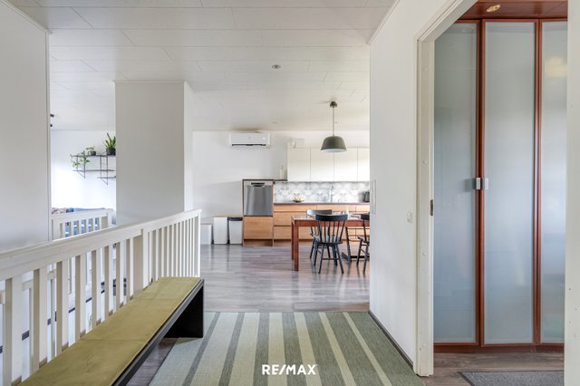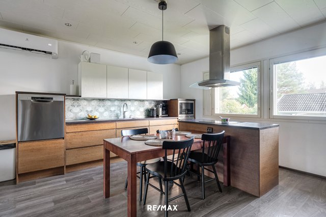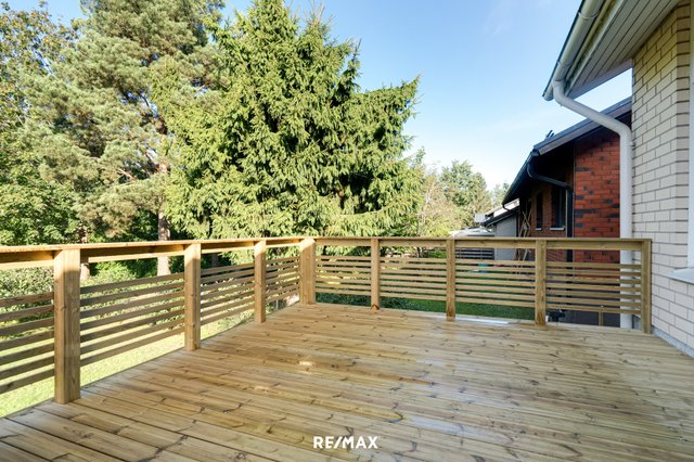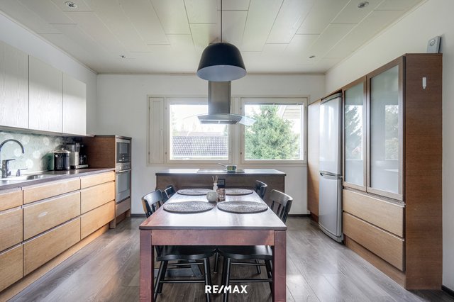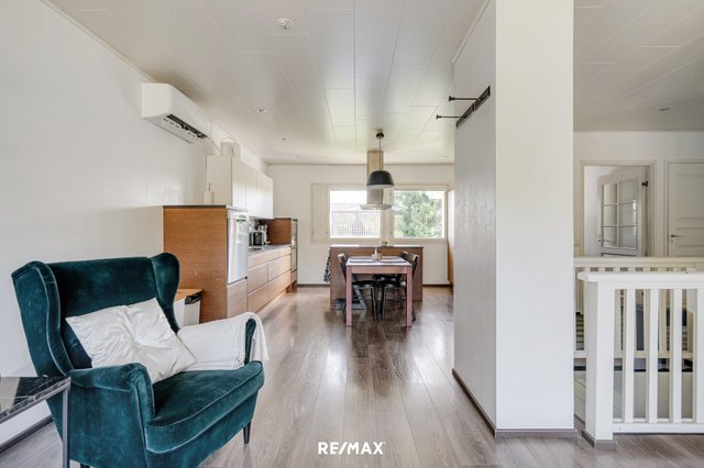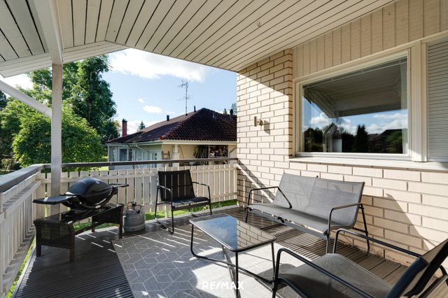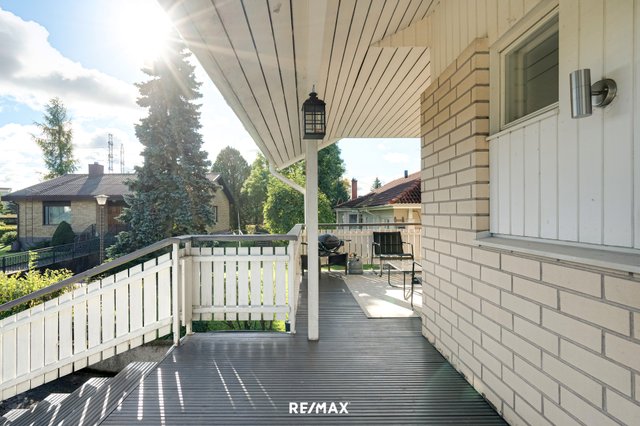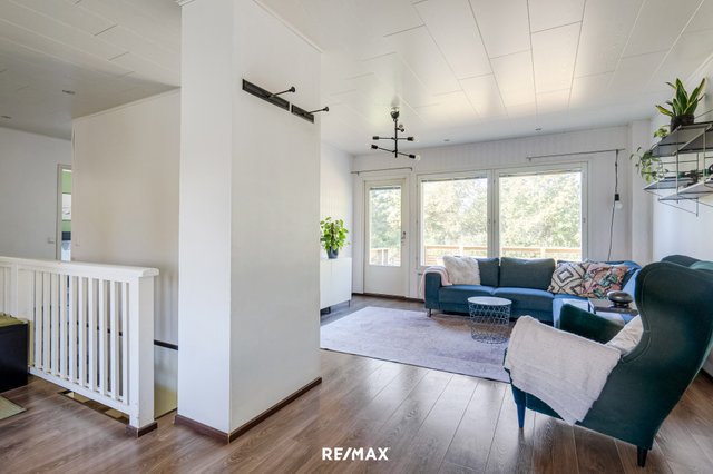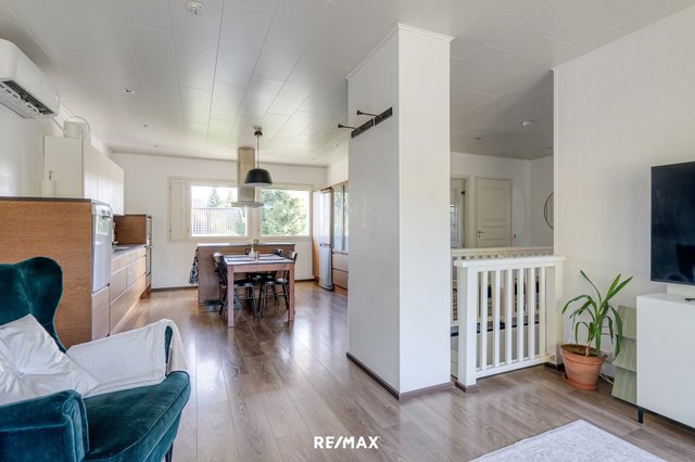Kahden kerroksen kodin pääkerroksessa on tilava olohuone isoilla ikkunoilla, josta on kulku tuliterälle salaojaremontin jälkeen valmistuneelle ilta-aurinkoiselle terassille. Avokeittiö on yhtenäistä tilaa olohuoneen kanssa, joten koko perhe voi viettää yhdessä aikaa kokkaillen ja jutustellen. Pääkerroksesta löytyy myös kaunis, kertaalleen uusittu wc sekä kodin kolme makuuhuonetta kaapistoineen. Ilmalämpöpumpulla saa oleskelutilat lämmitettyä tai viilennettyä, tarpeen mukaan.