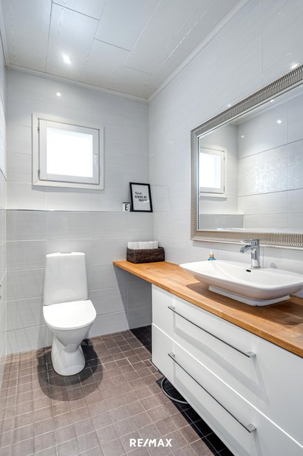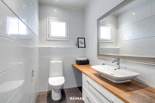 - Yläkerran upea wc on uusittu 2015. Varustuksena: wc-istuin, bidee-suihku, peili, allaskaapisto, sähköinen lattialämmitys, LED-valaistus. Alakerran wc on kylpytilojen yhteydessä, ja sen varustuksena on: lattialämmitys, wc-istuin, bidee-suihku, allaskaapisto, peili kaapeilla ja valoilla.