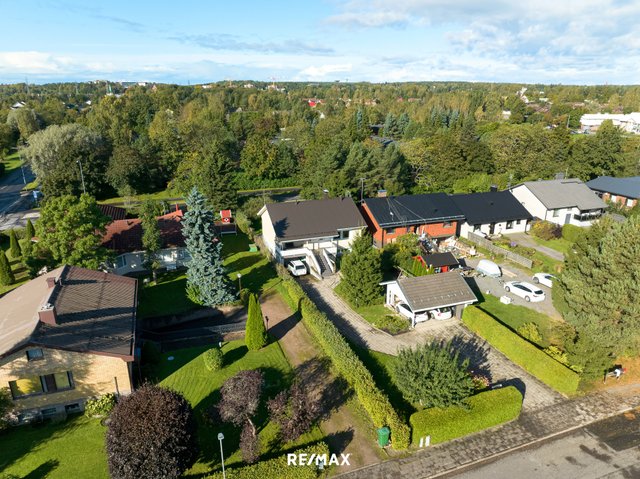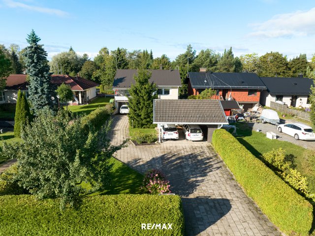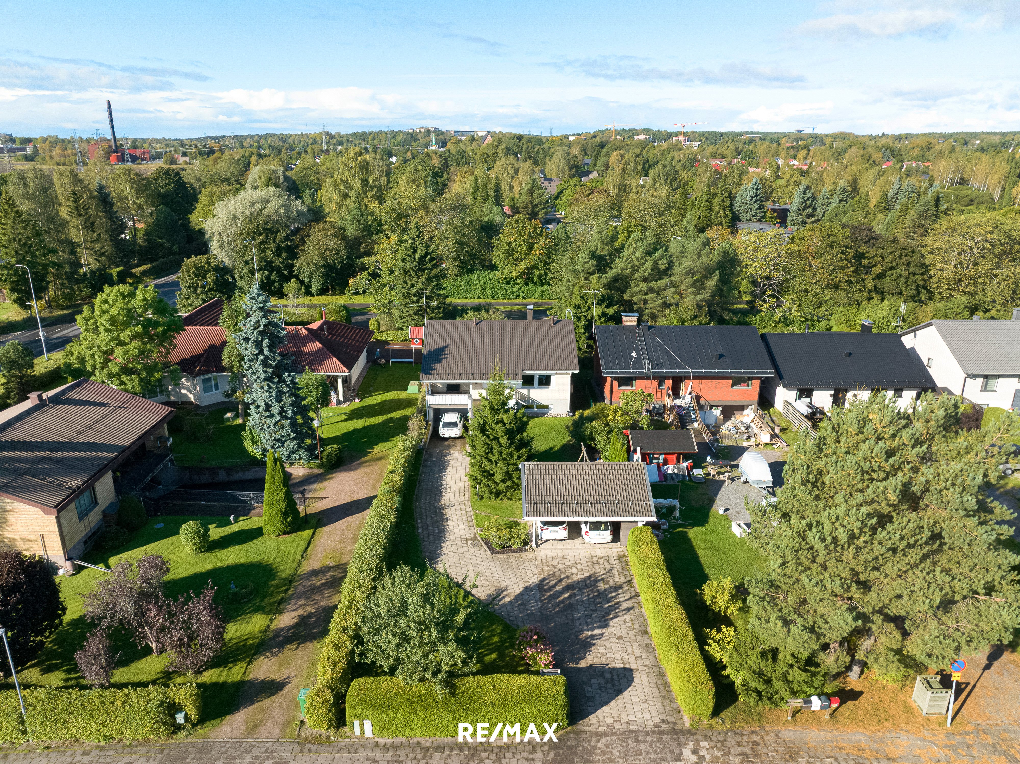 Vehreää tonttia on hoidettu kauniisti, ja osa siitä on aidattu kokonaan. Pihatie on laatoitettu ja nurmialuettakin löytyy sopivasti vaikka lasten tai lemmikkien leikkeihin. Heti pääsisäänkäynnin yhteydessä on tilava katettu aamupäiväaurinkoinen terassialue aamukahveja varten. Talon edustalla on kahden auton autokatos, toki myös autotallitilaa löytyy talon kellarikerroksesta. Keinu ja hiekkalaatikko odottavat jo seuraavia leikkijöitä.