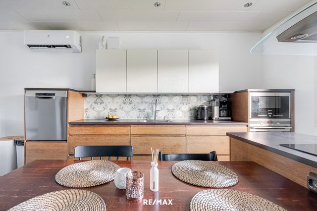 - Jääkaappipakastin, uuni (integroitu korkeammalle), liesi (uusittu 2022), liesituuletin (koneellinen poisto hormiin), mikroaaltouuni (integroitu), ja astianpesukone (uusittu 2022)