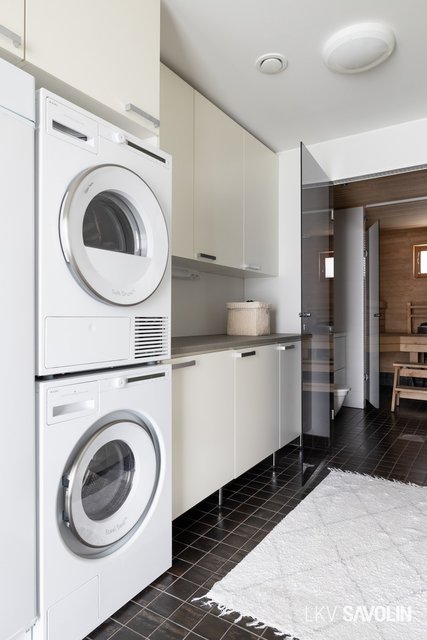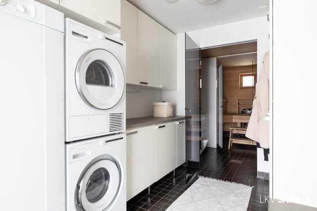 - Pesukoneliitäntä, tila pesutornille, kuivauskaappi, pyykkikaapit, kurapiste, pöytätaso, ja keskuspölynimuri (Letku uusittu 2025)