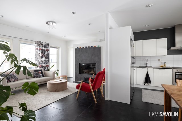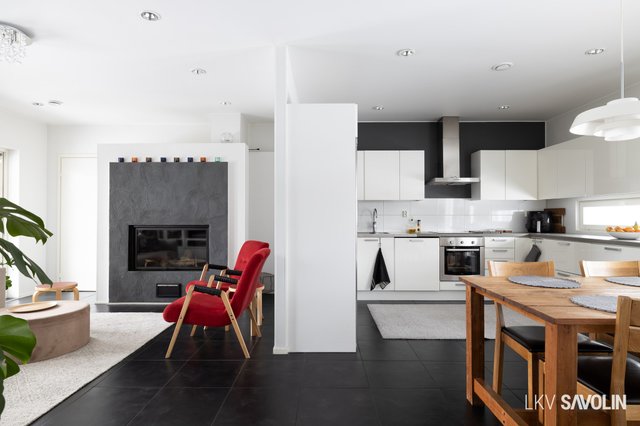 Kahteen kerrokseen jakautuva pohjaratkaisu on käytännöllinen ja toimiva. Alakerrassa avara olohuone ja keittiö muodostavat yhtenäisen, valoisan tilan, jossa on helppo viettää aikaa yhdessä. Suuret ikkunat tulvivat sisään luonnonvaloa, ja varaava takka luo lämpöä ja tunnelmaa. Keittiössä on runsaasti säilytystilaa ja hyvät puitteet ruoanlaitolle.