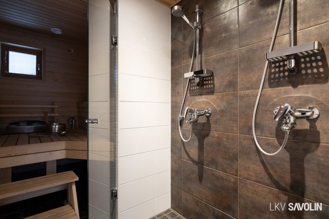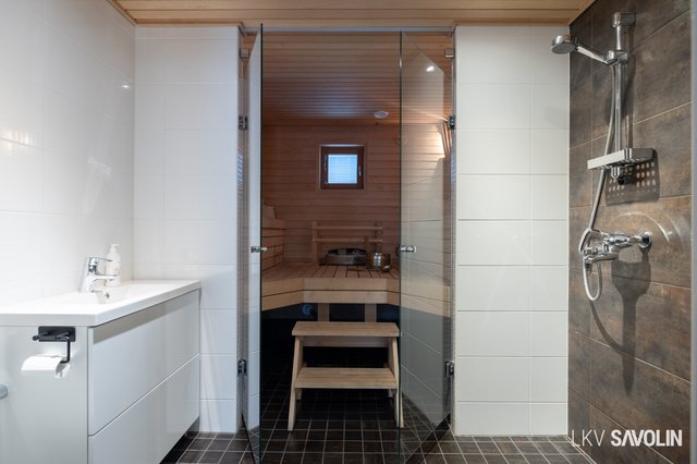 Makuuhuoneita on yhteensä neljä, ja yläkerrassa on mahdollisuus myös viidennen huoneen toteuttamiseen. Kaksi erillistä wc:tä sekä tilava kodinhoitohuone kurapisteineen tekevät arjesta sujuvaa. Kylpyhuoneessa on kaksi suihkua ja saunassa lauteet molemmin puolin, jotka tuovat ripauksen luksusta arkeen.