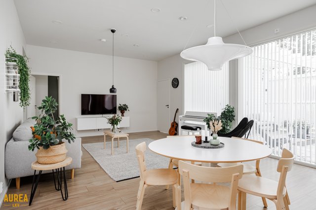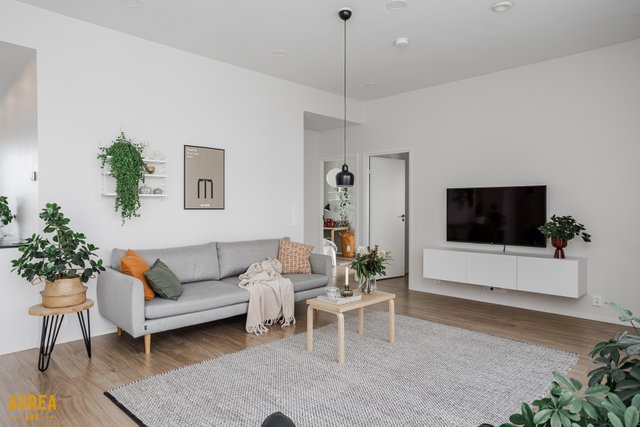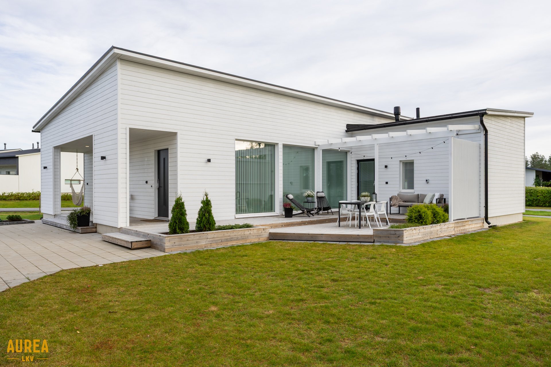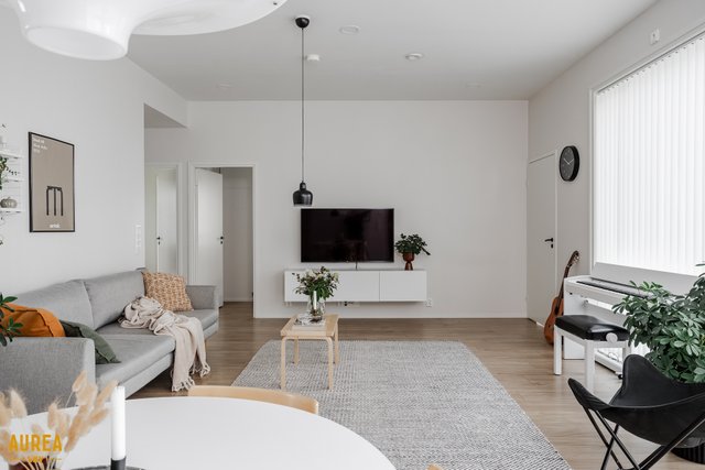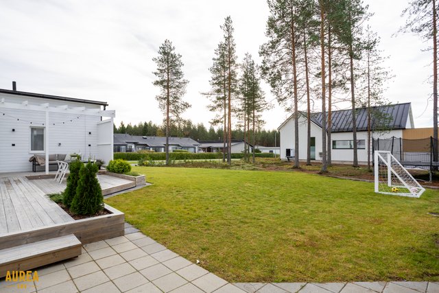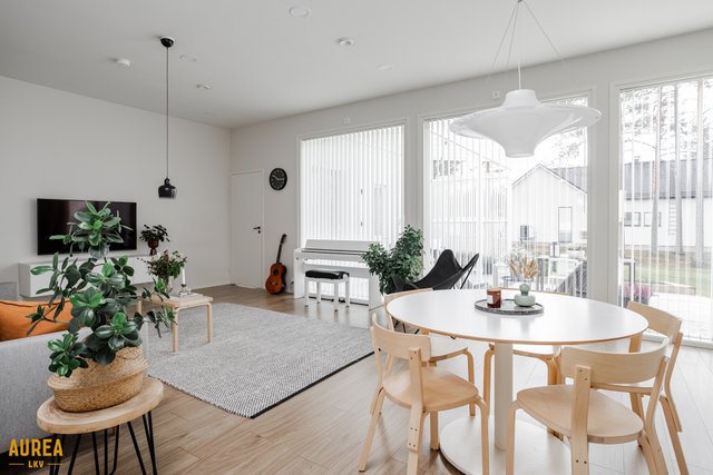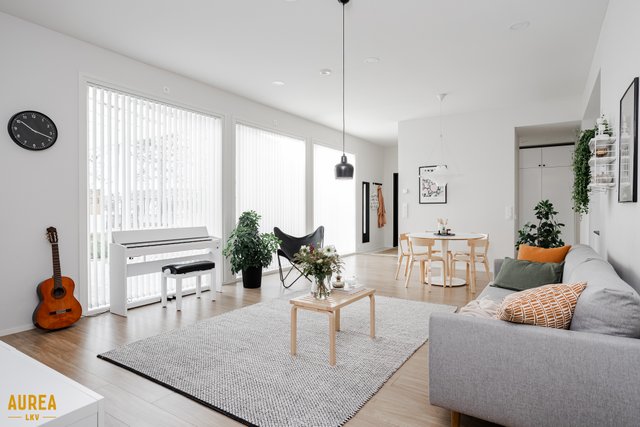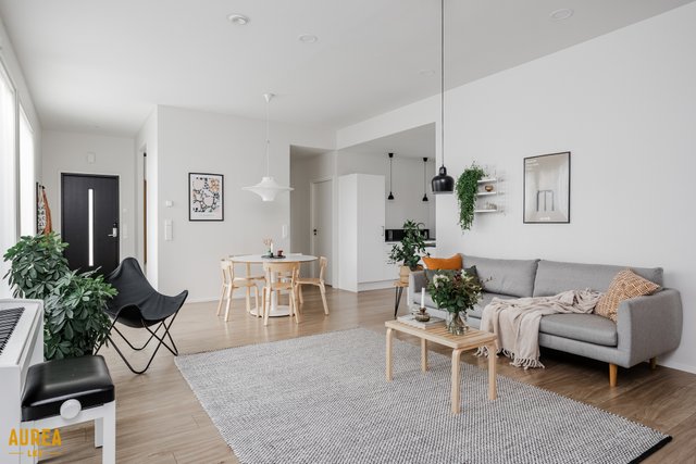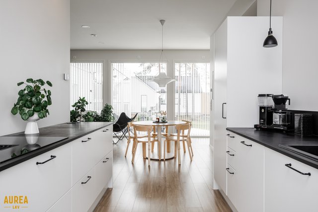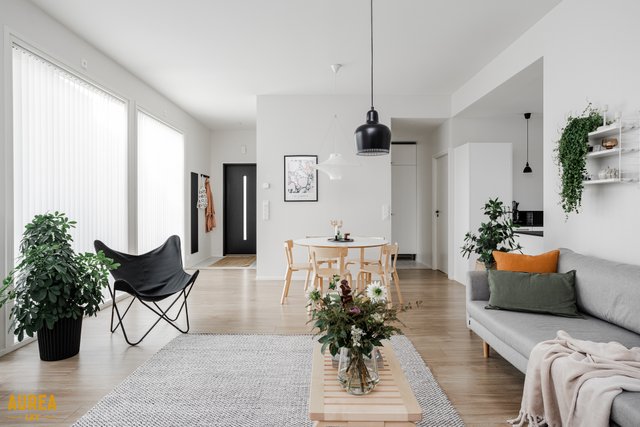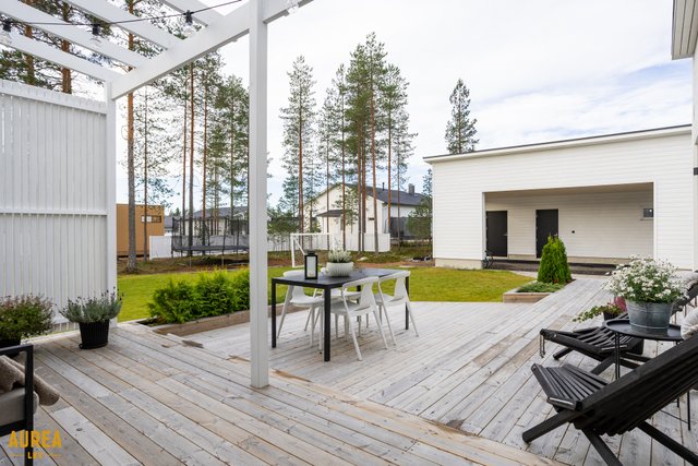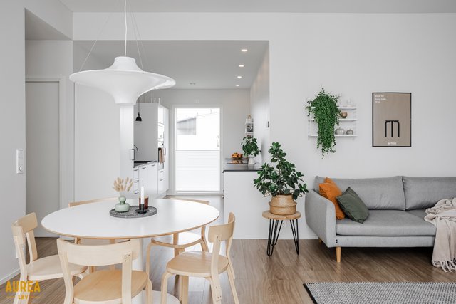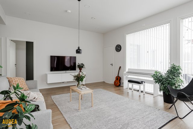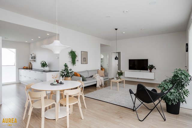 Keittiö on suunniteltu toimivaksi ja varustettu laadukkailla kodinkoneilla. Kodin sydämenä toimii tilava olohuone, jonka suuret ikkunat tuovat runsaasti luonnonvaloa ja tekevät tilasta avaran. Olohuoneesta on kulku talon eteläpuolella olevalle terassialueelle.