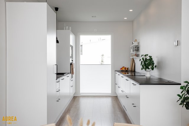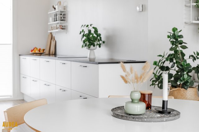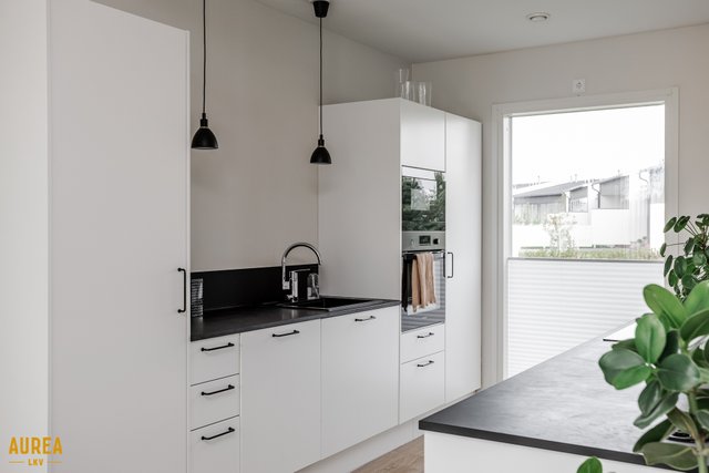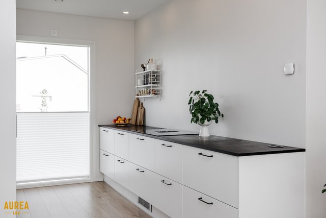 - Vaalea Limosa keittiö, tummat tasot.