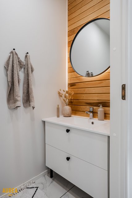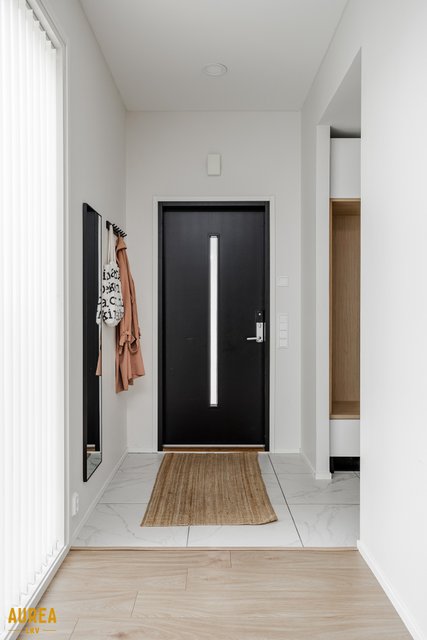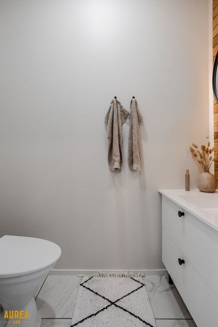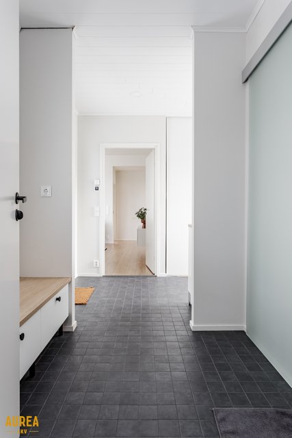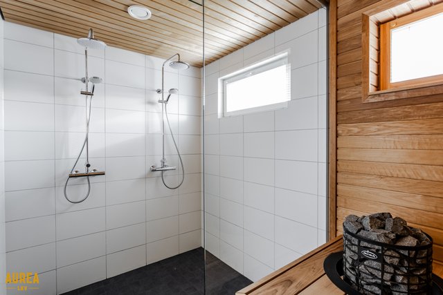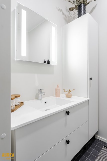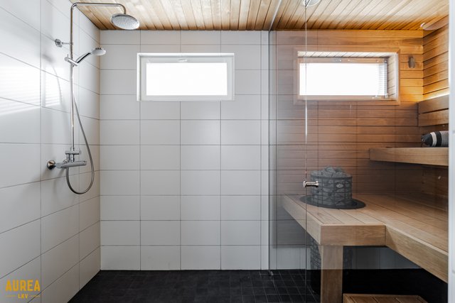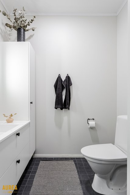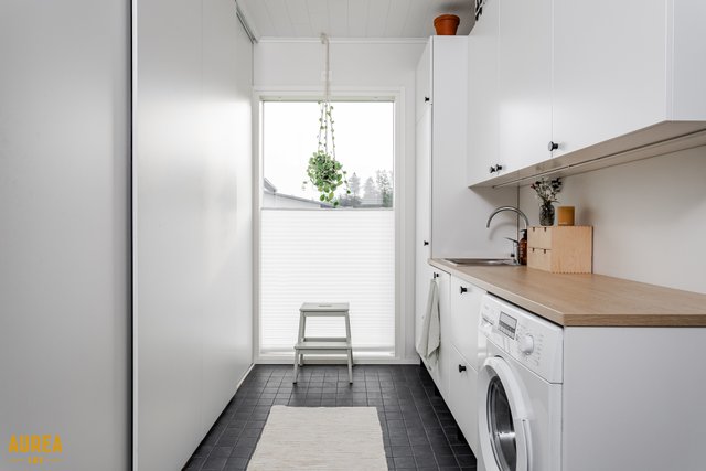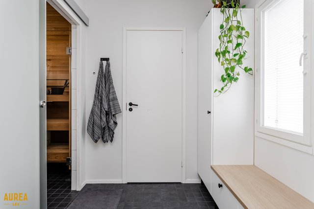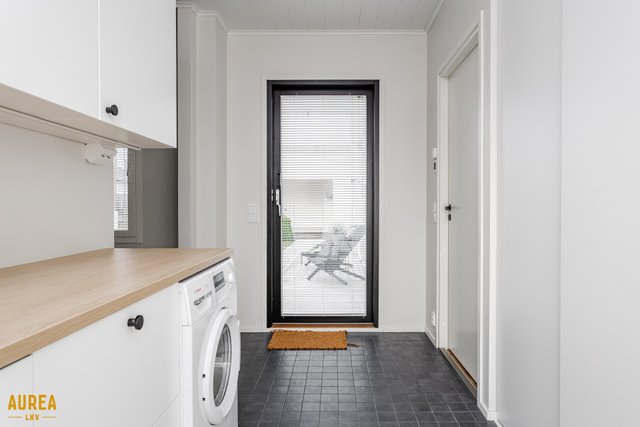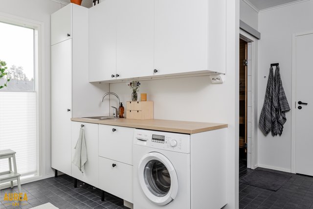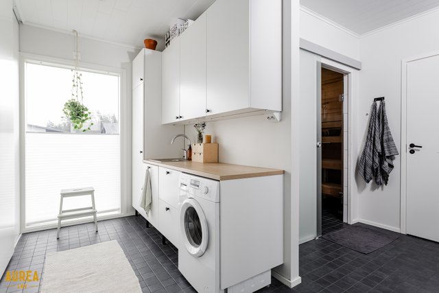 Arjen sujuvuuteen on panostettu myös kodinhoitohuoneessa, jossa on oma sisäänkäynti, runsaasti säilytys- ja tasotilaa sekä paikat pyykinpesukoneelle ja kuivausrummulle. Kylpyhuone on tyylikäs ja toimiva, ja sen yhteydessä on ikkunoilla varustettu sauna tasolauteineen ja pilarikiukaineen. Kodissa on lisäksi kaksi erillistä wc:tä, mikä lisää arjen käytännöllisyyttä.