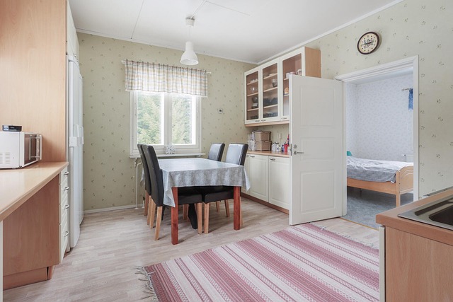 - -02 uusittu Puustellin keittiö. Tilava keittiö, mihin mahtuu reilunkokoinen ruokailuryhmä. Hyvin kaappitilaa. Katto maalattu.