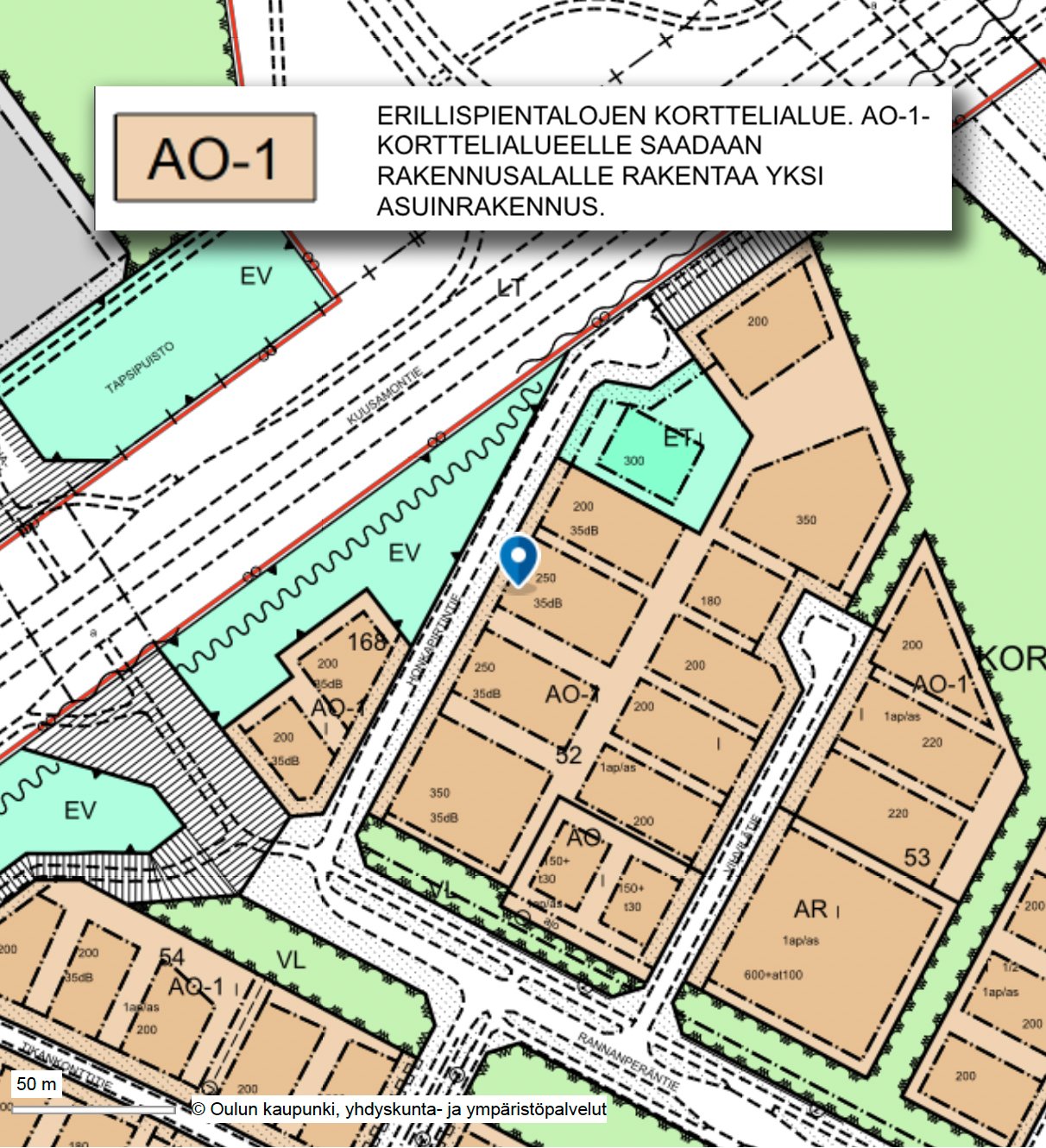 - AO-1 ERILLISPIENTALOJEN KORTTELIALUE. AO-1-KORTTELIALUEELLE SAADAAN RAKENNUSALALLE RAKENTAA YKSI ASUINRAKENNUS. 35dB MERKINTÄ OSOITTAA ALUEEN TAI RAKENNUSALAN, JONKA RAKENNUSTEN ULKOSEINIEN, IKKUNOIDEN JA MUIDEN RAKENTEIDEN ÄÄNENERISTÄVYYDEN MELUA VASTAAN ON OLTAVA VÄHINTÄÄN 35DB(A).