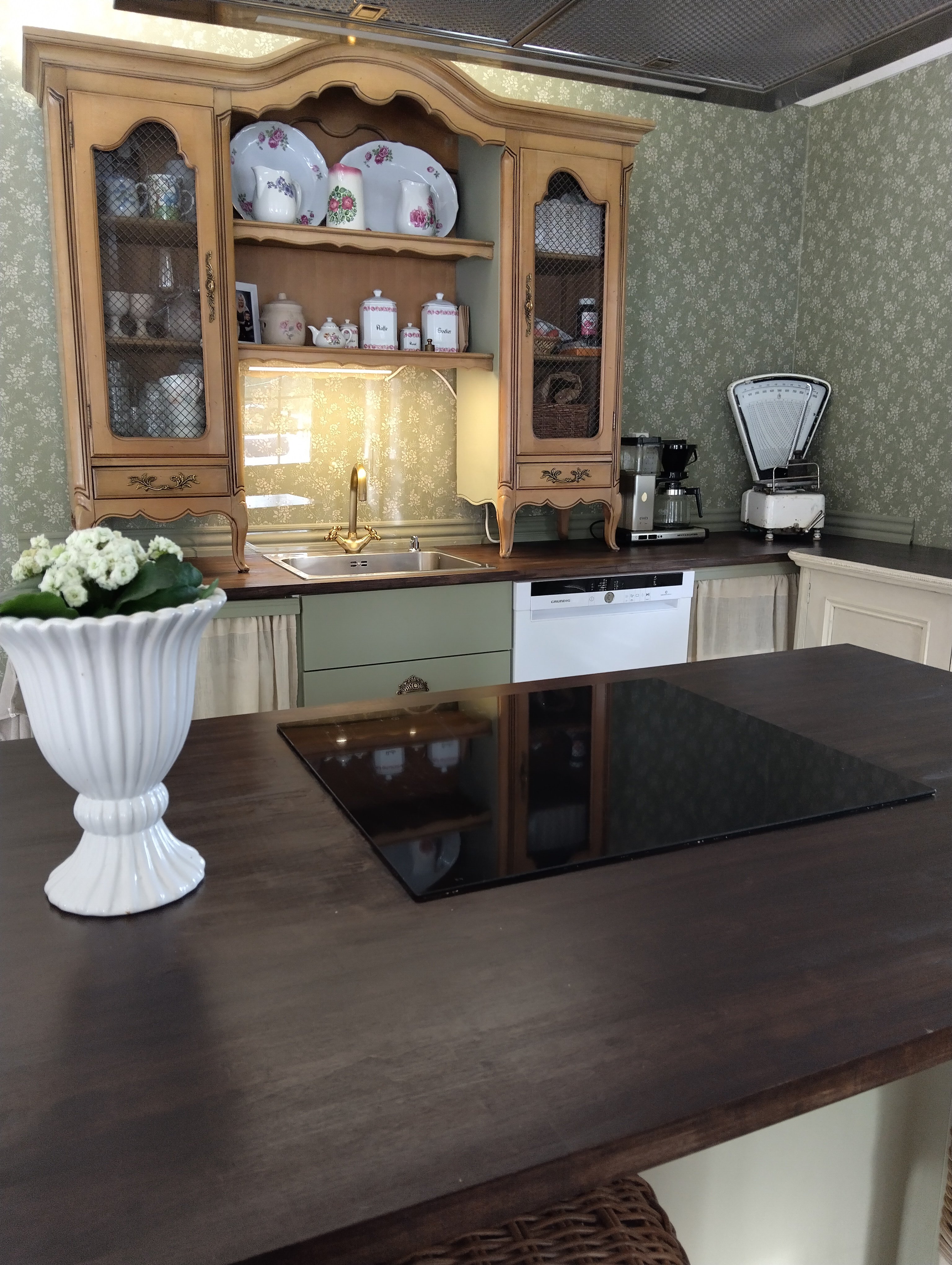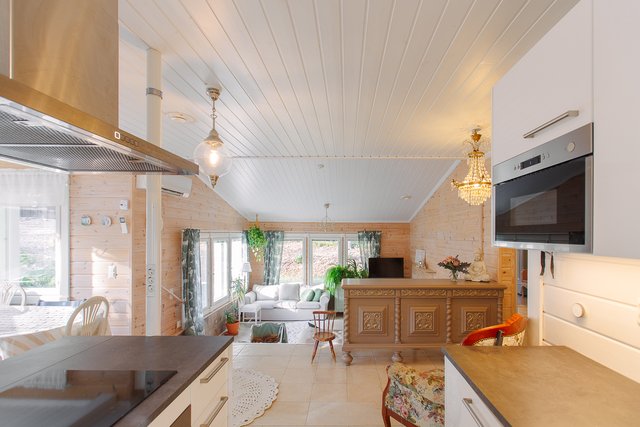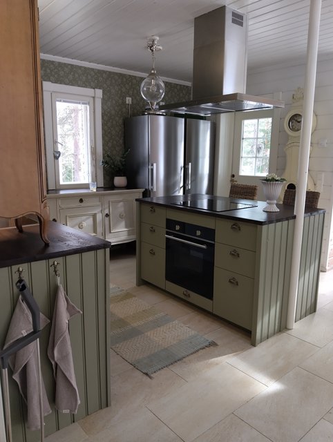 - Keittiö valmistunut 2020, pintoja päivitetty 2025: Kaapistot , saareke, jossa erillis-kiertoilmauuni, induktioliesi ja liesikupu, jääkaappi, pakastin, mikroaaltouuni, astianpesukone. Seinämateriaalit: Maali (2025) ja hirsi Lattiamateriaalit: Kaakeli Työtasot: Laminaatti