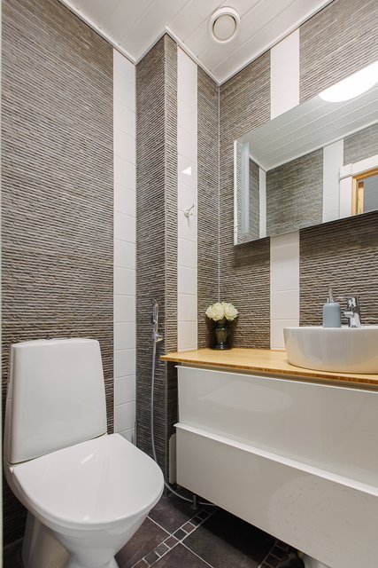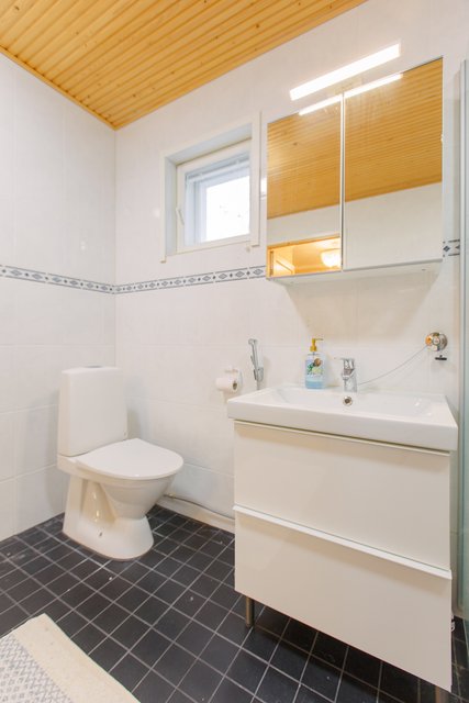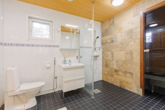 - Valopeili. Varusteet: WC-istuin, allaskaappi, pesuallas, bidee-suihku ja lattialämmitys Seinämateriaalit: Kaakeli Lattiamateriaalit: Laatta