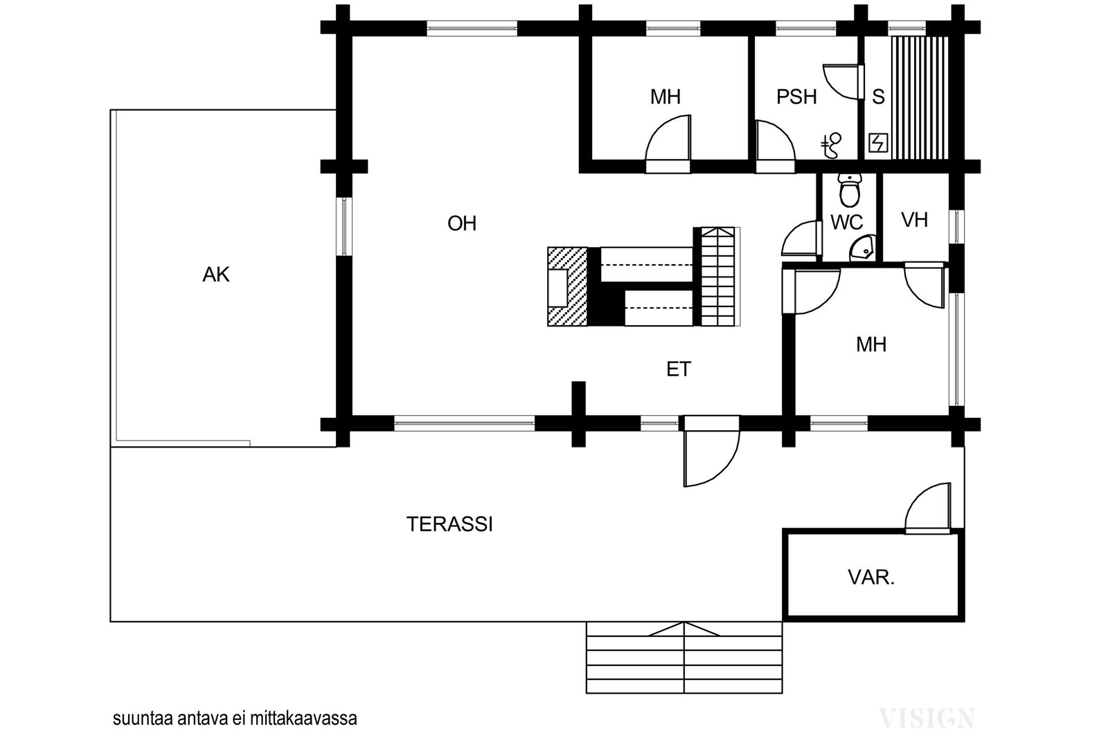 - -Kirjaimilla A, H, I, L, M ja N merkityt kuusi huoneistoa (yksittäistaloja) käsittävät eteistilan, tuvan, kaksi makuuhuonetta, parven, varaston ja kuistin. Huoneiston pinta-alatiedot ovat seuraavat: rakennusala 78,1 m2 parvi 25,6 m2 varasto 4,3 m2 kuisti 20,7 m2 Käyttöala yhteensä 128,7 m2