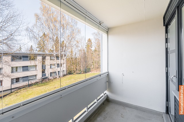 Valoisa ja avara pohjaratkaisu, lasitettu parveke.
