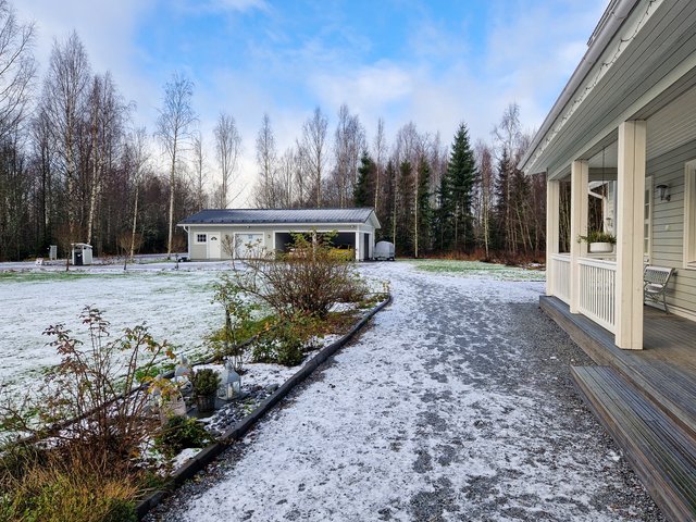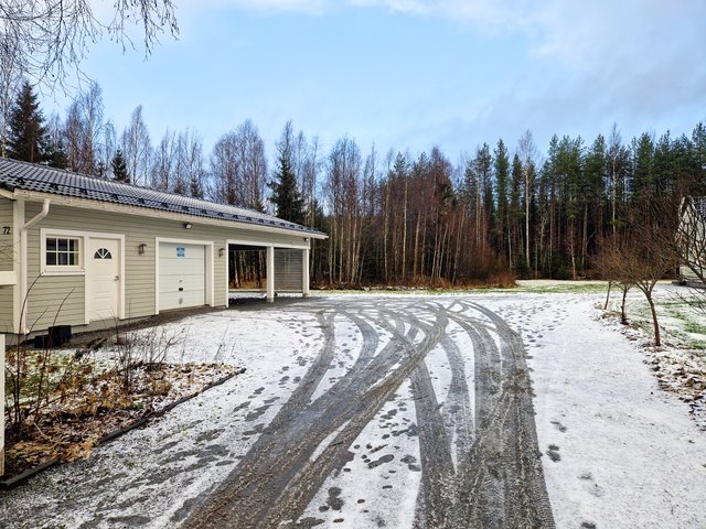 - Autotalli yhdelle autolle ja katos kahdelle autolle. Autotallin yhteydessä on kaksi lämmintä ikkunallista varastoa (sähkölämmitys lattiassa), joista toiseen oma sisäänkäynti. Talli, joka toimii tällä hetkellä varastona, lattialämmitysvaraus (sähkökaapeli ei kytketty). Tynnyrisauna kantovedellä.