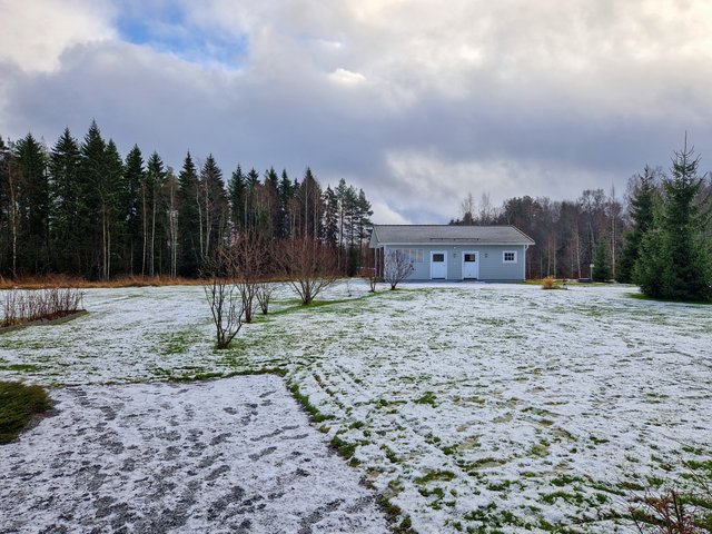 autotallin ja talon sokkelit tasoitettu ja maalattu, autotallin ulkoseinät maalattu