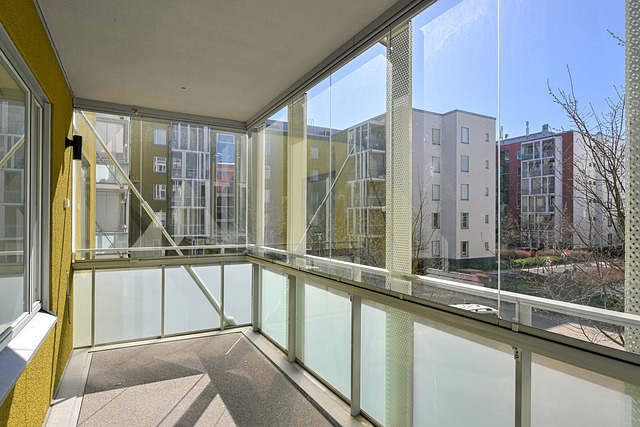 Olohuoneesta käynti suurelle lasitetulle parvekkeelle, ilmansuunta sisäpihalle haluttuun länteen.