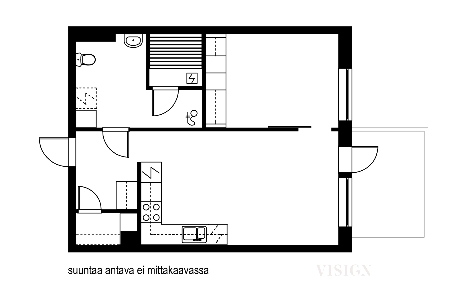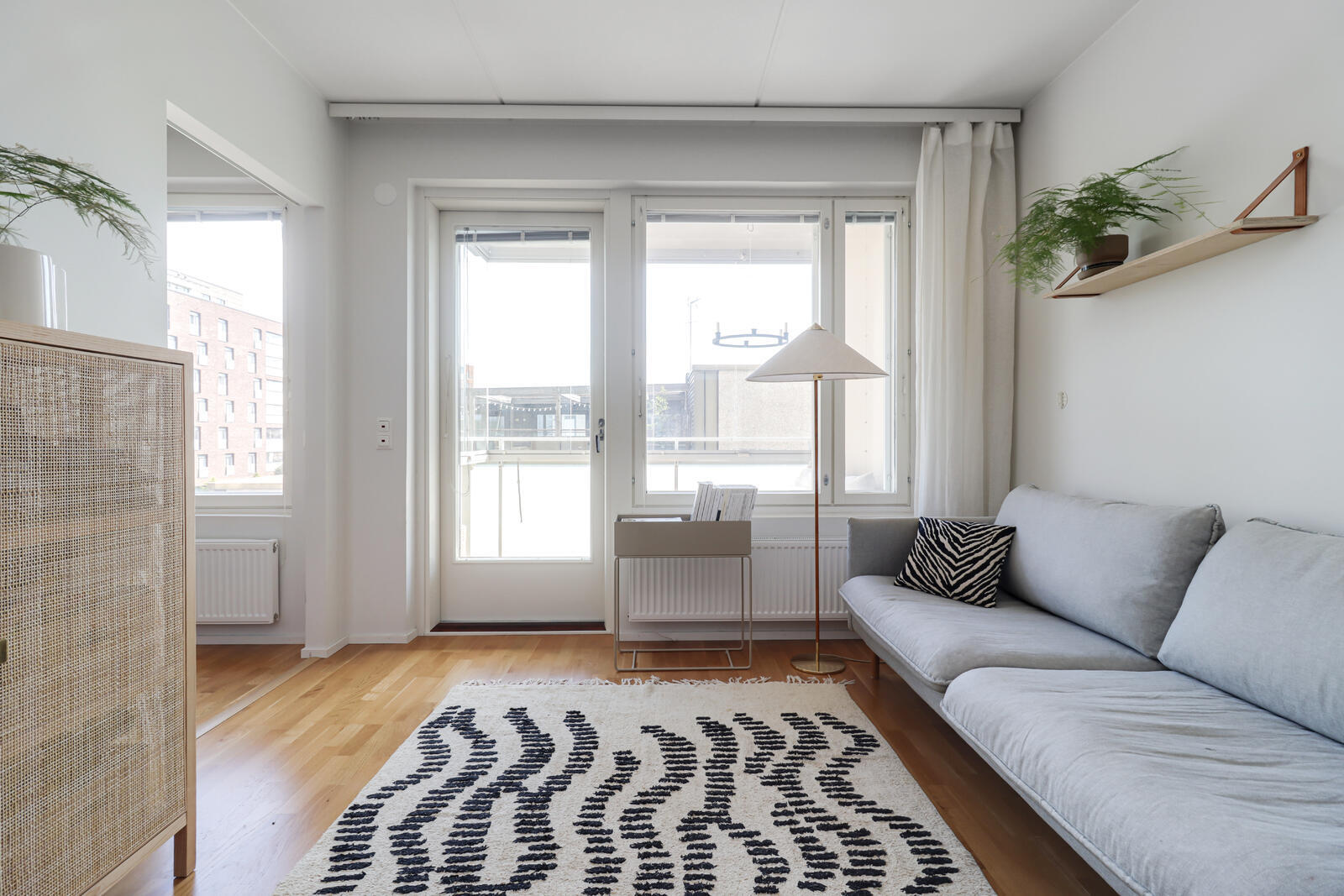 Asunnossa on toimiva yhdistetty keittiö ja olohuone, josta on käynti tilavalle lasitetulle parvekkeelle. Hyvän kokoinen makuuhuone on varustettu liukuovella. Suuressa kylpyhuoneessa on oma kulmaus suihkutilalle, saunan vieressä. Vaatehuoneeseen voi halutessaan laittaa esimerkiksi työpisteen.