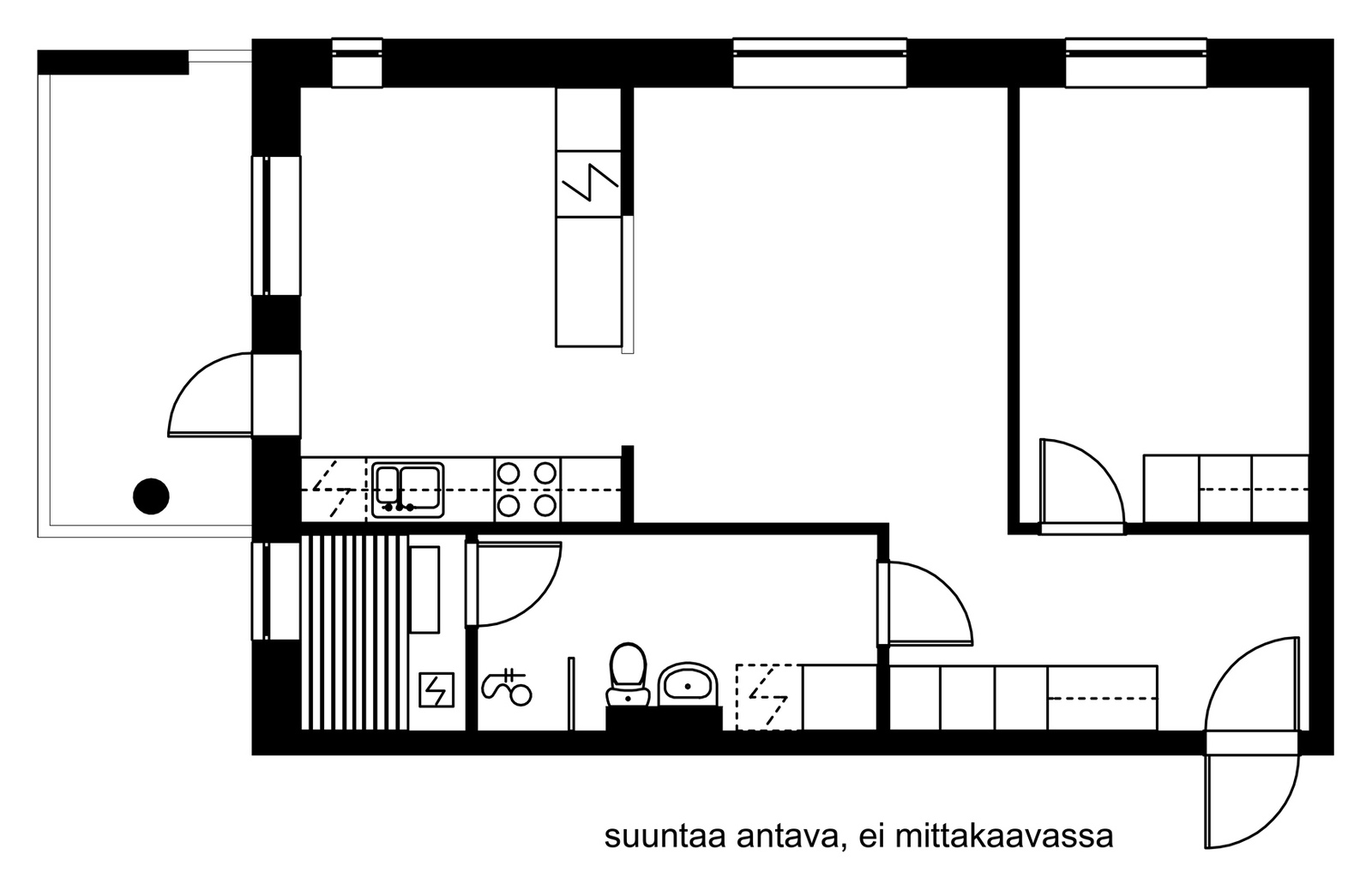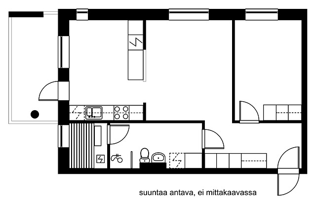 - Allaskaappi, wc-istuin, pesukoneliitäntä, lattialämmitys, suihku, ja kiinteät valaisimet