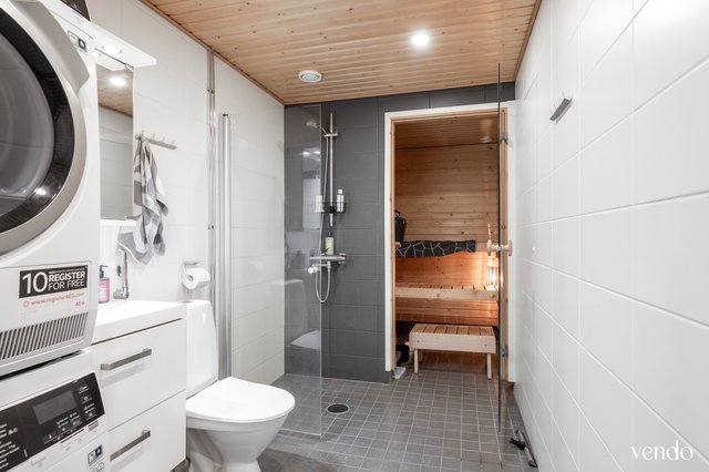 - WC-istuin, suihku, suihkuseinä, pesukoneliitäntä, pesuallas, peilikaappi, lattialämmitys, allaskaappi, ja bidee-suihku