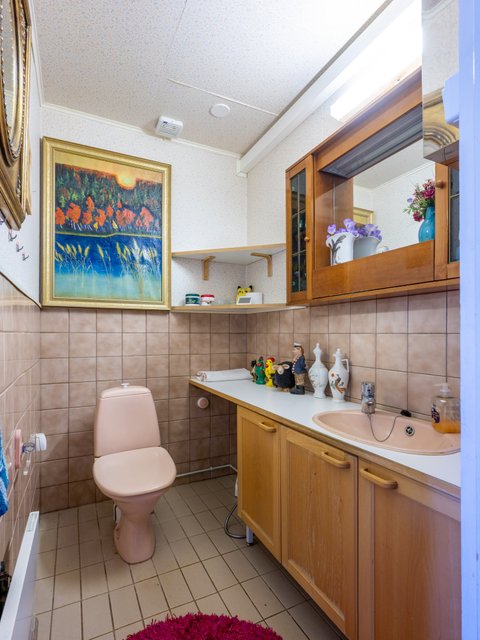 - Erillisen wc:n varusteena on wc-istuin, pesuallas, allaskaappi ja peili. LATTIA: laatta SEINÄT: kaakeli ja maali