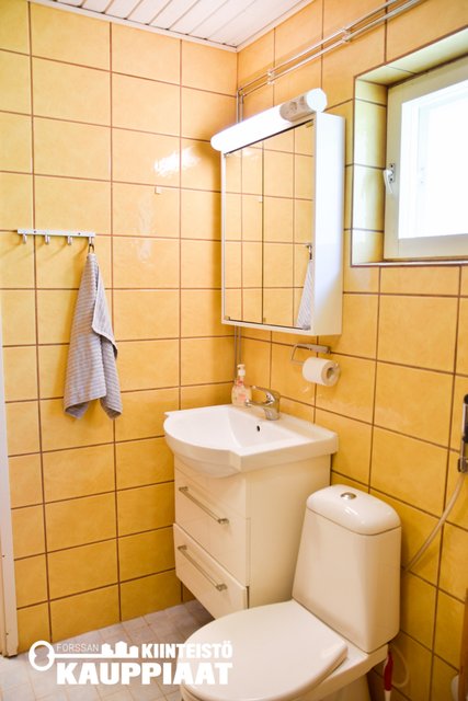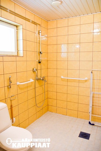 - Laatoitetussa pesuhuoneessa lattialämmitys, suihku, toinen vessa ja käsienpesulavuaari.