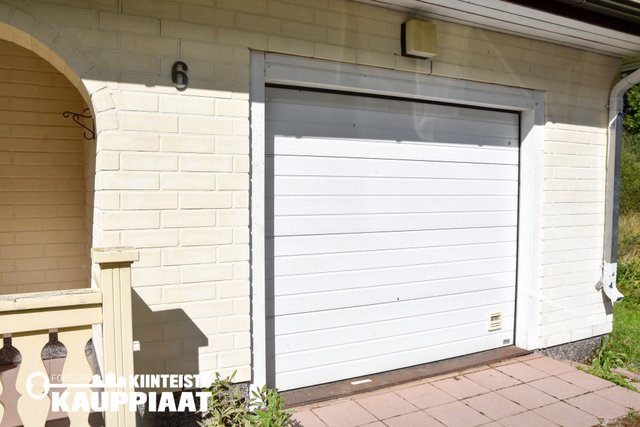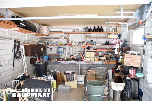 Kodinhoitohuoneessa on laatoitettu lattia ja paikka pyykkikoneelle sekä kuivurille. Huoneesta on myös oma uloskäynti. Lisäksi talon yhteydessä on autotalli ja varasto.