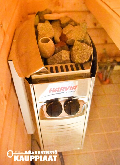 - Paneloidussa saunassa on sähkölämmitteinen kiuas.