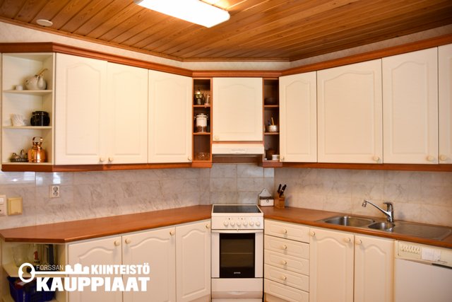 - Parkettilattia, vaalean sävyiset kaapistot ja hyvin kaappitilaa. Kodinkoneina sähköliesi, jääkaappi/pakastin ja astianpesukone.